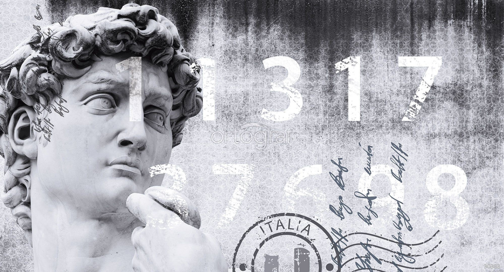 На изображении представлена античная статуя мужской фигуры с выразительными локонами и мускулистым торсом, выполненная в классическом стиле. Фон украшен крупными графическими цифрами, элементами каллиграфии и печатью с надписью "ITALIA", что создаёт ассоциации с итальянским искусством и историей.