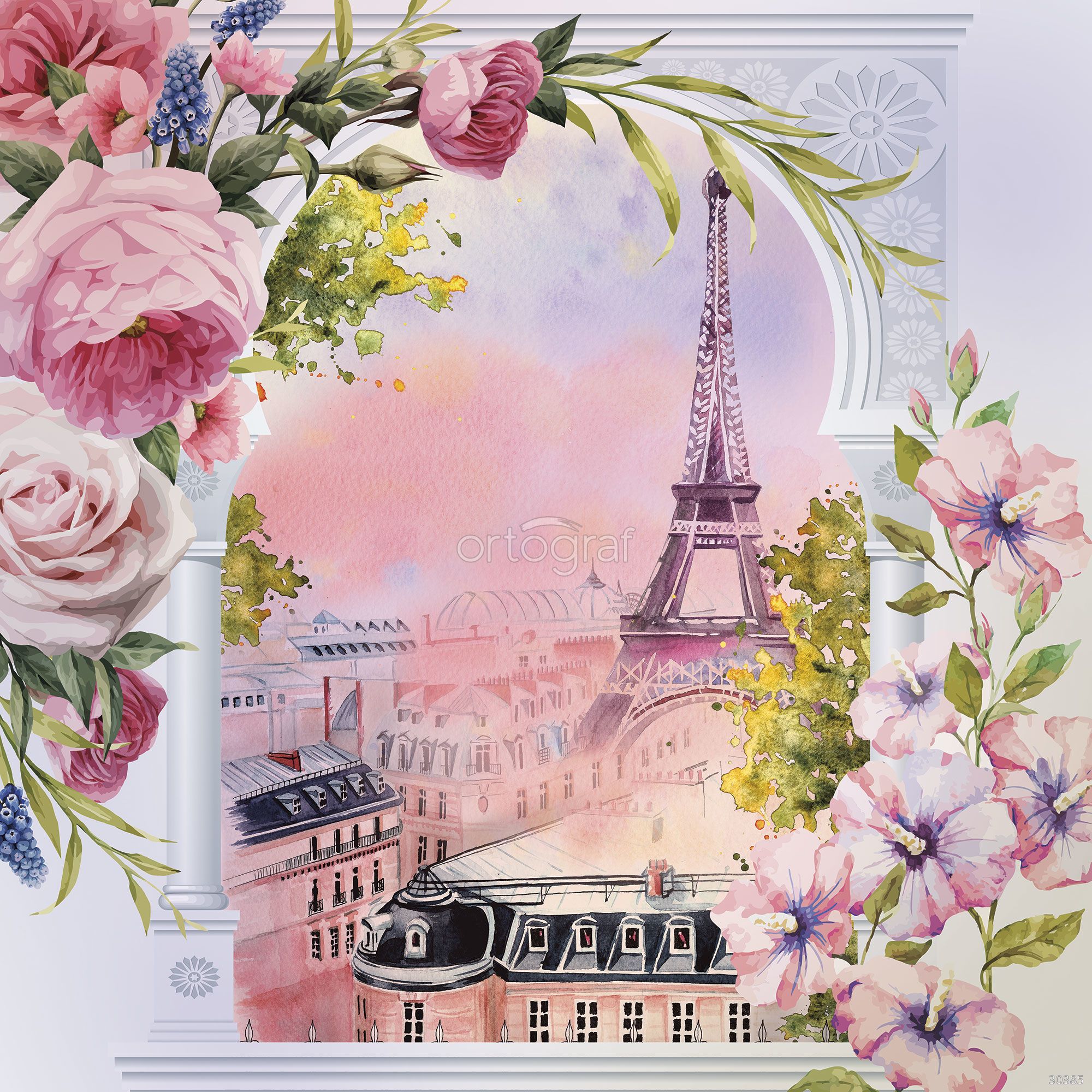 На изображении изображён архитектурный вид на узнаваемую городскую достопримечательность, окружённую классическими зданиями и пышными цветами на переднем плане. Через декоративную арку открывается перспектива на башню, подчёркнутую элементами городского пейзажа и романтическими деталями ботанического декора.
