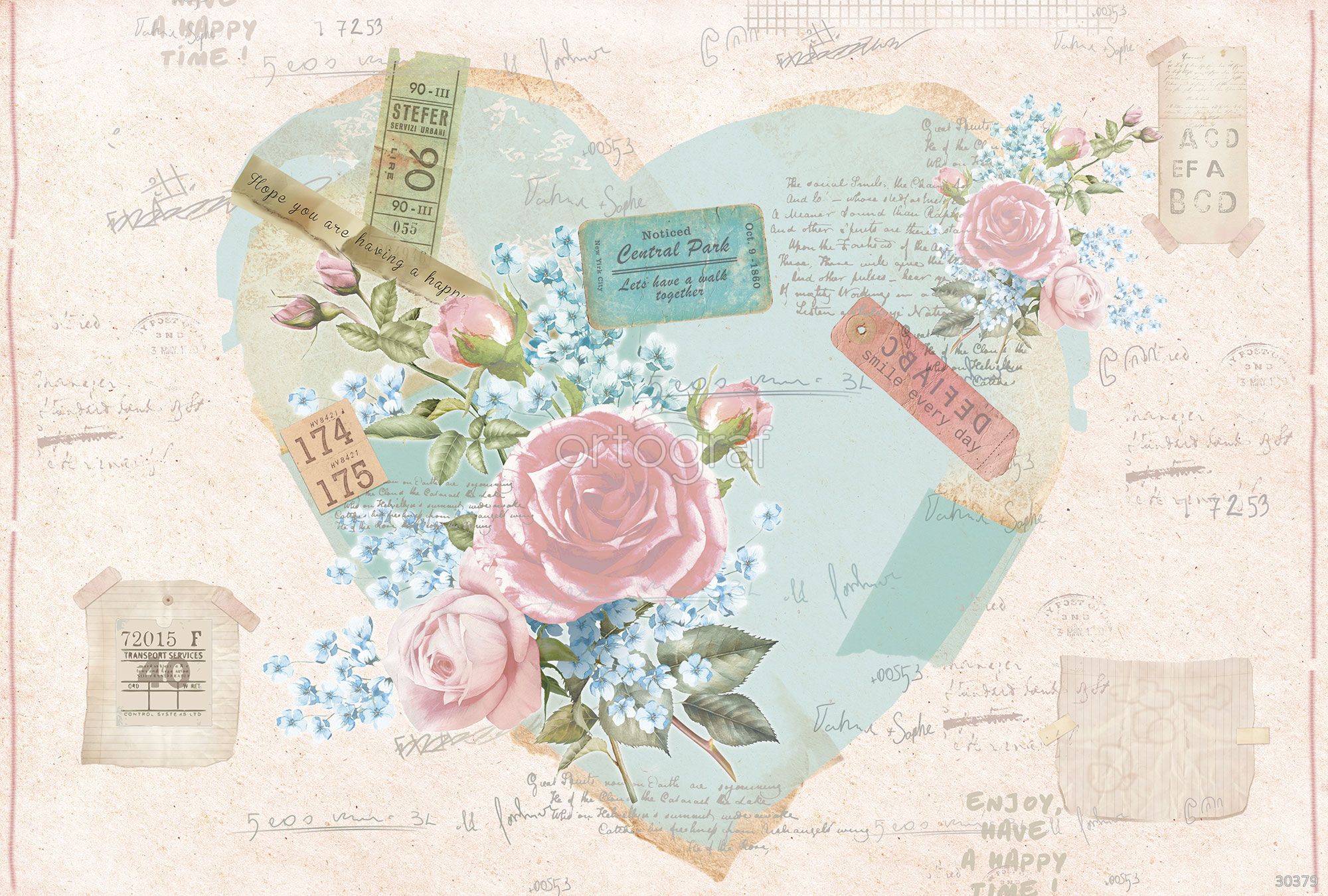 На изображении представлена изящная композиция с большим сердцем, украшенным винтажными билетами, рукописными заметками и цветочными букетами из роз и незабудок. Сцена дополнена фразами, пожеланиями и элементами ретро-стиля, создающими атмосферу романтики, ностальгии и заботы.