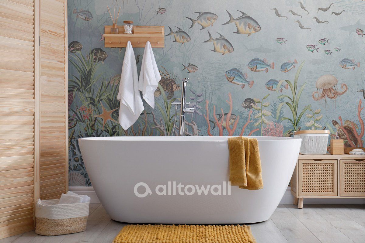 Красочные обои с изображением множества подводных обитателей. Сюжет в морской тематике «Коралловый риф» будет отлично смотреться в ванной комнате, в кабинете или гостиной.