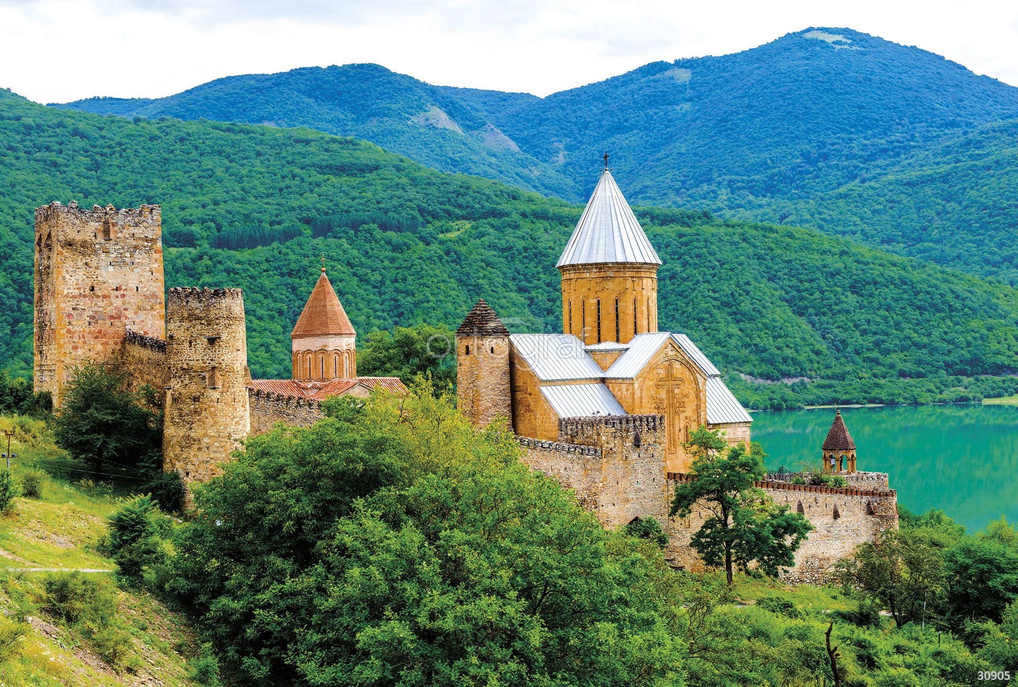 Внушительный исторический ансамбль с замком и башнями, расположенный среди густых зеленых холмов и у спокойной глади воды, создает атмосферу древности и гармонии с природой. Такой сюжет добавляет интерьеру нотку величия, уюта и культурного наследия, идеально подойдет для просторных помещений с классическим или эклектичным стилем.