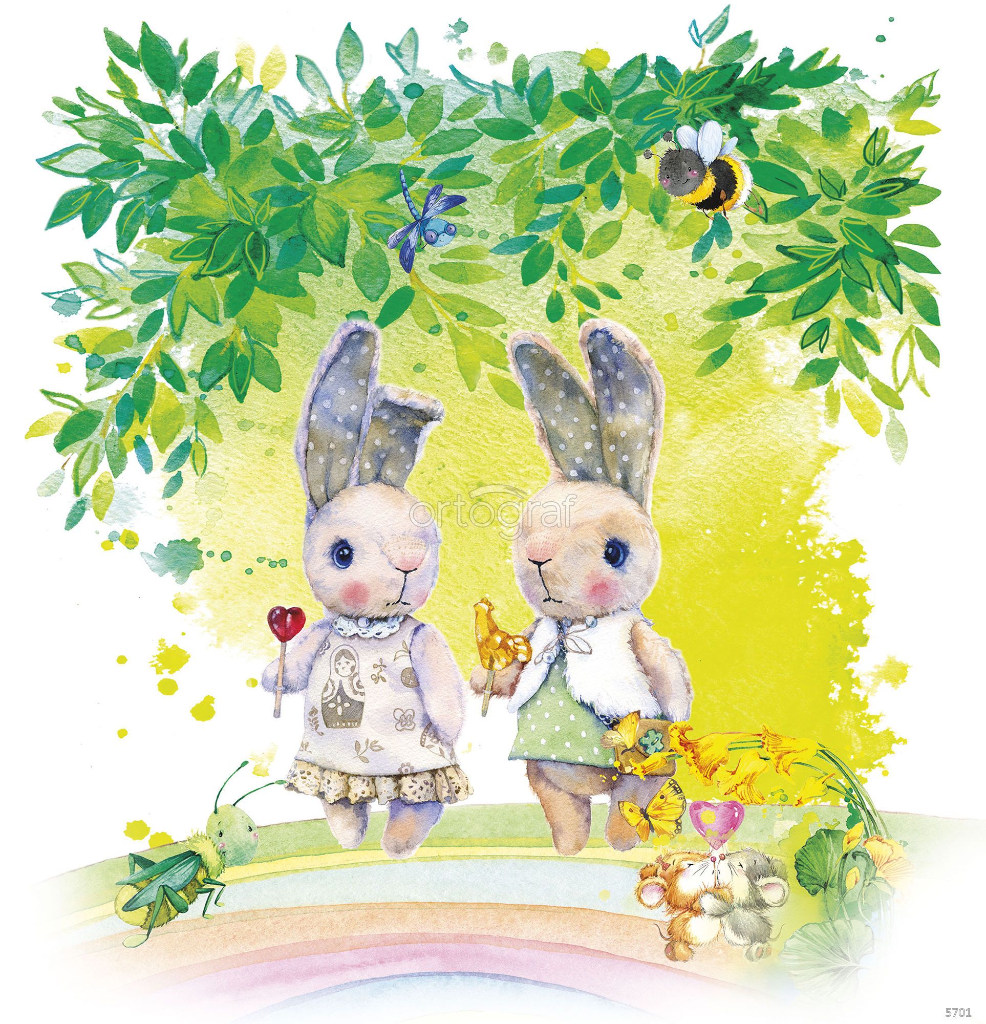 Два милых зайчонка с леденцами стоят на радуге, рядом цветы, насекомые и густая зелёная листва, что создаёт атмосферу доброй сказки и весёлого настроения. Такой сюжет отлично подойдёт для интерьера, где хочется добавить уюта, радости и сказочного очарования.
