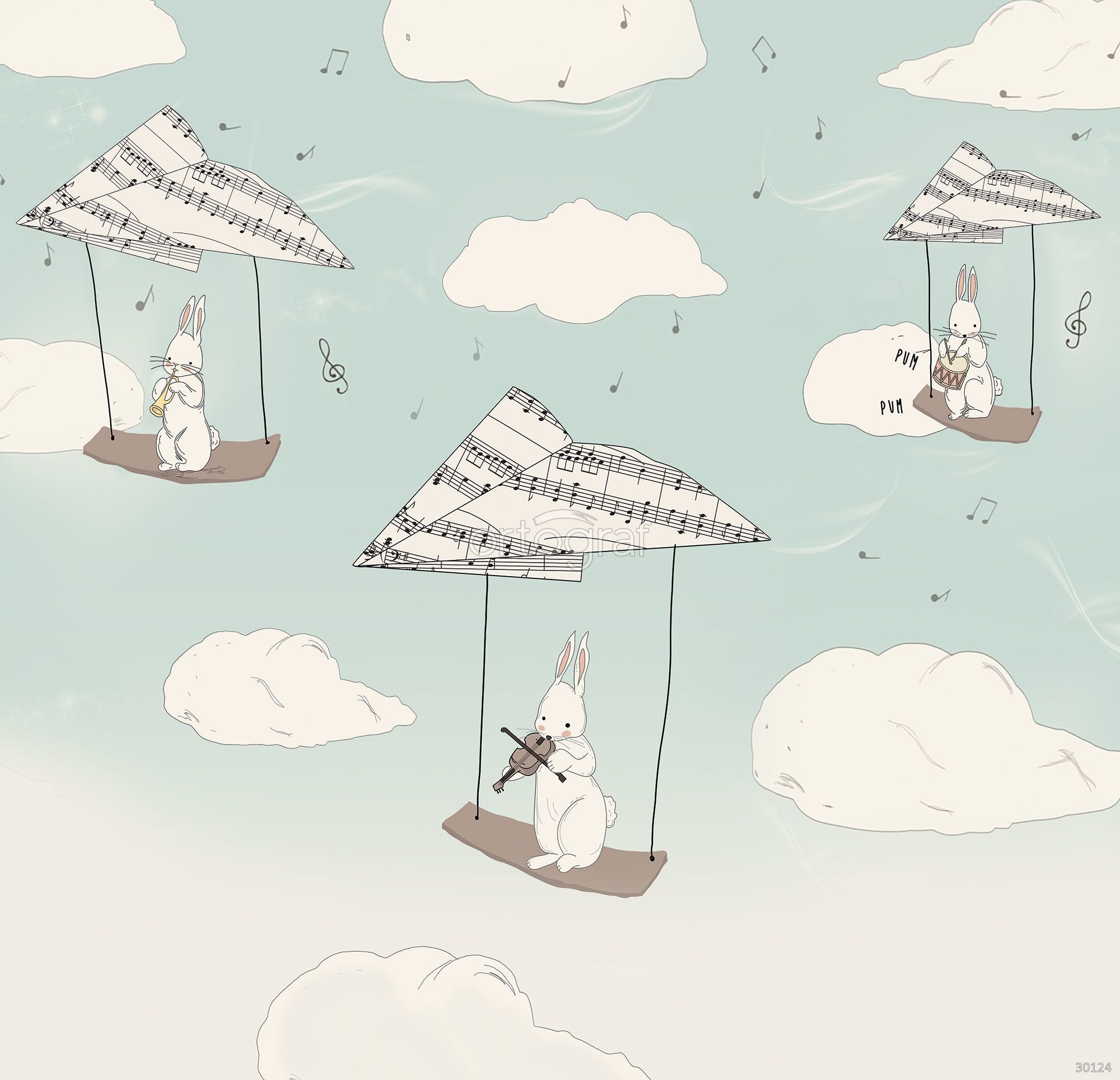 На картине изображены кролики, которые играют на музыкальных инструментах, сидя на качелях с крыльями из нотных листов, будто парящих среди облаков. Вокруг них летают ноты и символы музыки, создавая сказочное ощущение воздушного оркестра в небе.