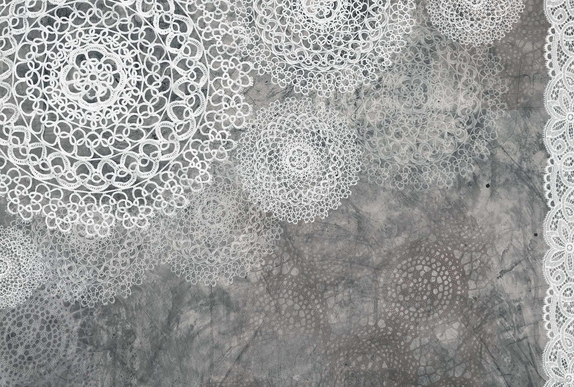 На изображении изящные ажурные кружевные узоры на фоне фактурной поверхности, создающие ощущение легкости и элегантности. Такой мотив помогает наполнить интерьер изысканным декоративным акцентом, внести в обстановку нотку уюта и стиля.