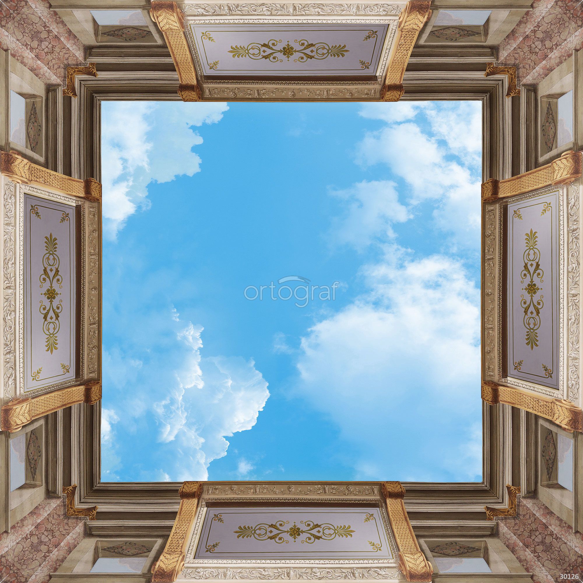 Изображение передаёт эффект перспективы — зритель будто смотрит вверх сквозь изящно оформленное оконное пространство или внутренний двор с декоративными балками. Архитектурное обрамление украшено лепниной и стилизованными панелями, а в центре располагается открытое пространство с облачным небом, создающее иллюзию свободы и гармонии между архитектурой и природой.