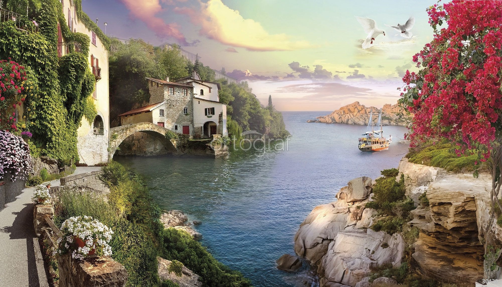 На изображении представлен живописный прибрежный пейзаж с каменными домами на склоне, старинным мостом, утёсами и бухтой. Вдоль воды проложена прогулочная дорожка с пышной растительностью, а в море плавает парусная яхта; над заливом парят птицы, создавая атмосферу уединения и гармонии с природой.
