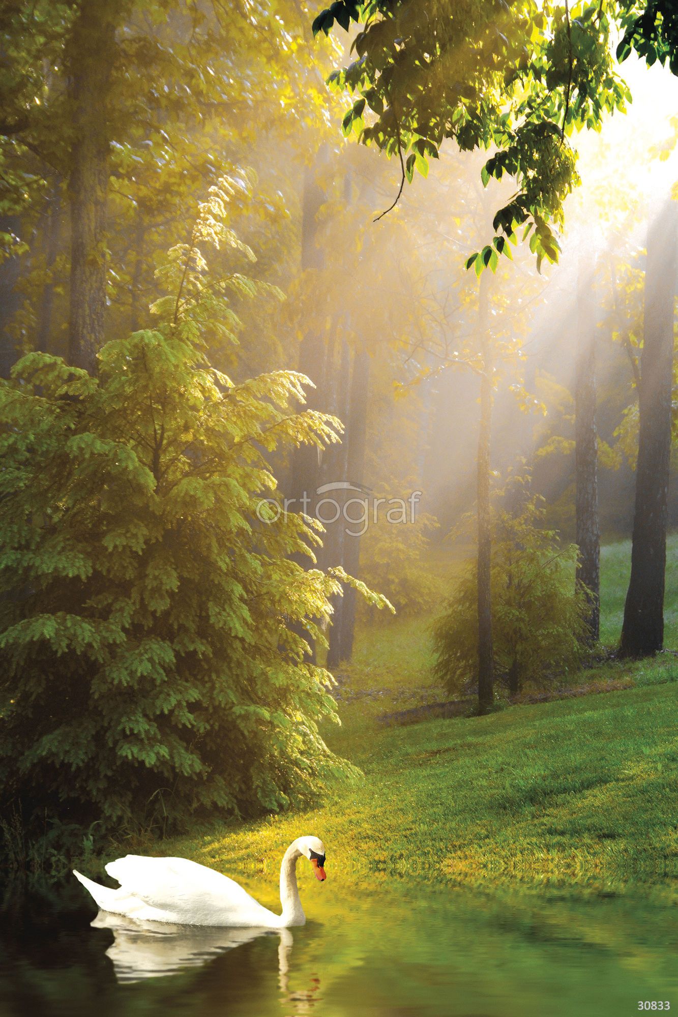 Лесная поляна с солнечными лучами, пробивающимися сквозь кроны деревьев, и плавающим на воде лебедем создает атмосферу уюта, умиротворения и гармонии с природой. Такой сюжет расслабляет, визуально добавляет света и свежести в интерьер.