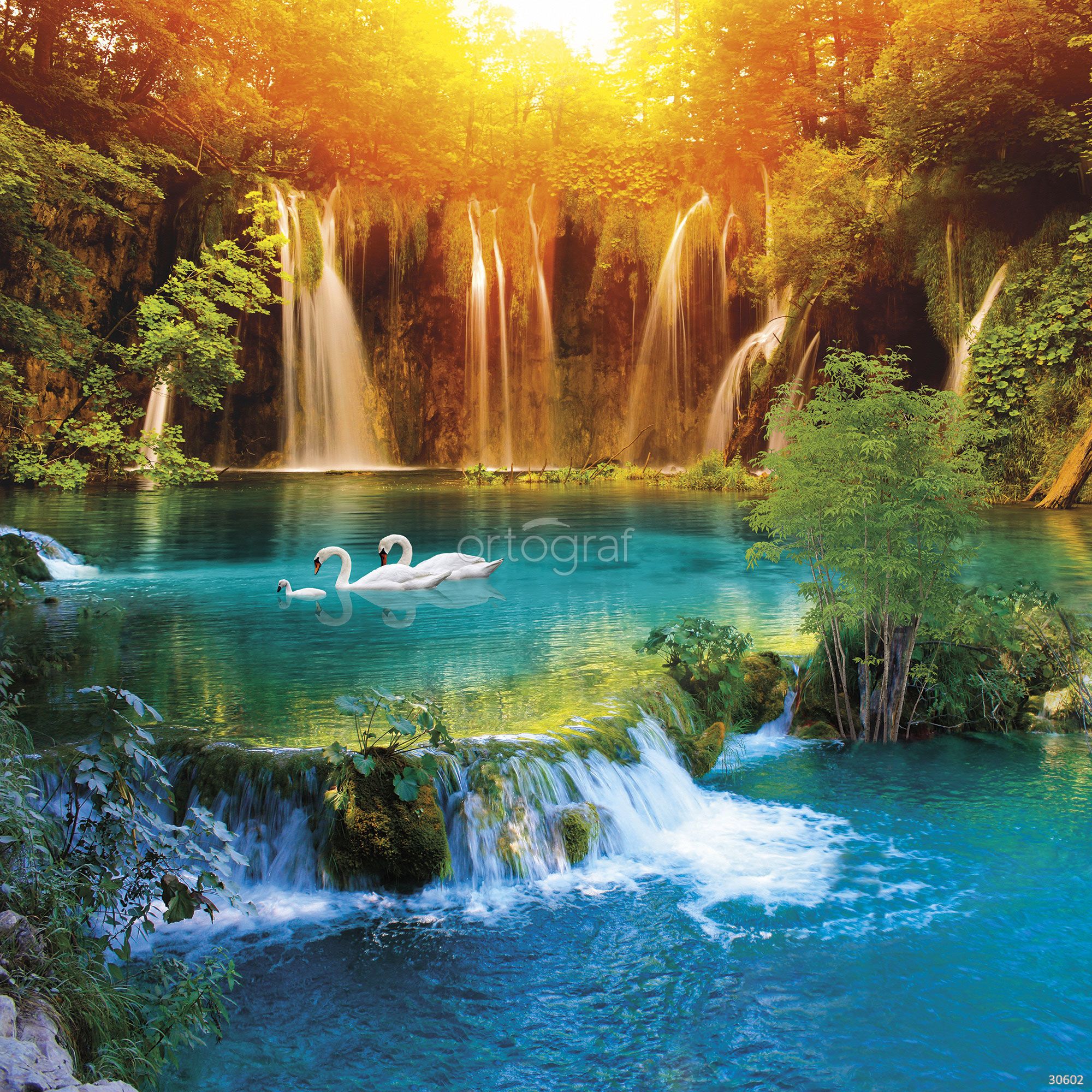 Сказочный пейзаж с тихим озером, водопадами и лебединой семьёй на воде. Атмосфера наполнена спокойствием, гармонией и мягким солнечным светом, создаёт ощущение естественной красоты и уюта. Такой сюжет прекрасно подойдёт для оформления спокойных и светлых помещений, добавив в интерьер ощущение свежести и умиротворённости.
