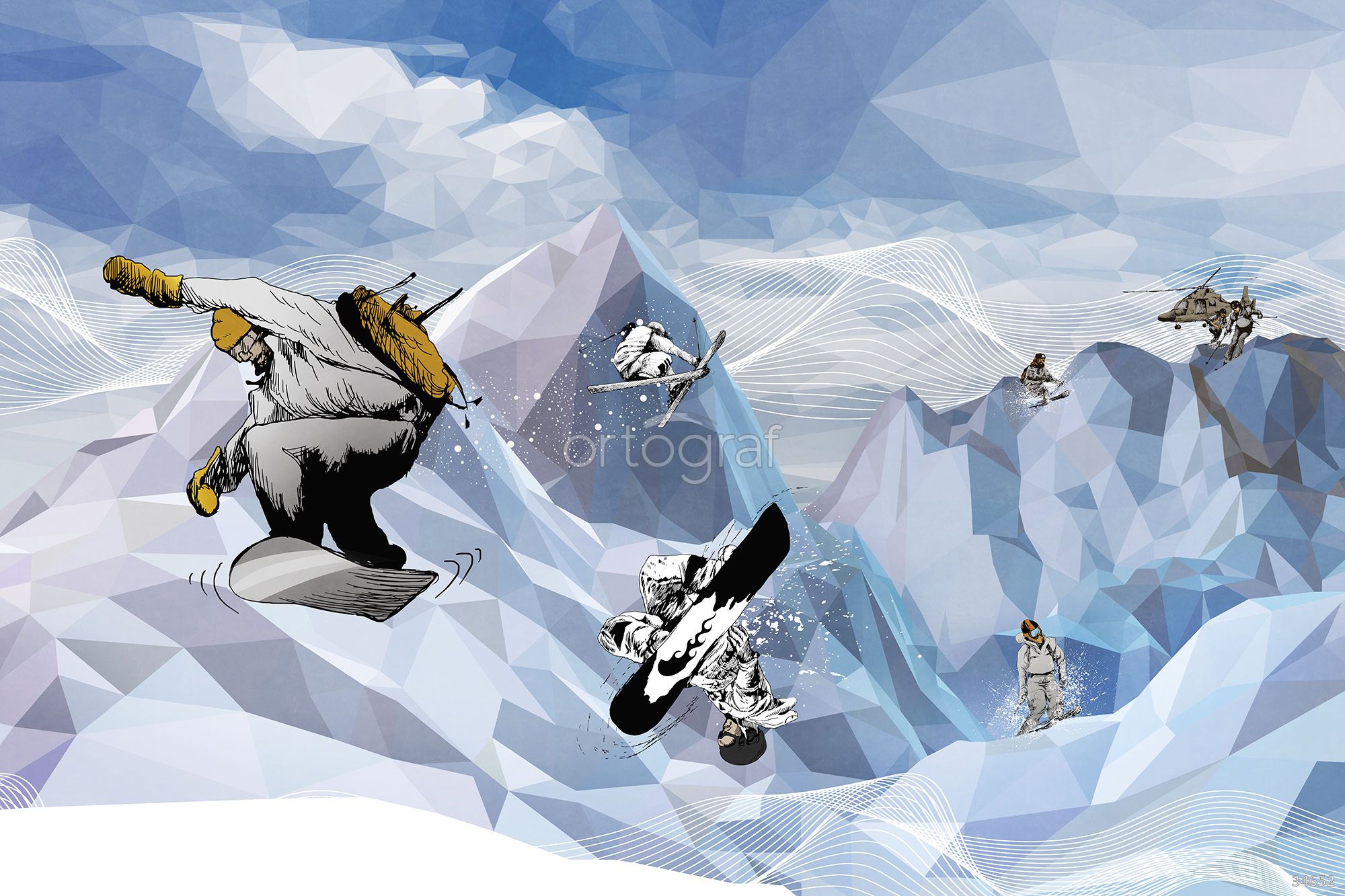 На фоне горных пиков показаны экстремальные трюки сноубордистов и лыжников, также изображены элементы фрирайда и вертолёт. Сюжет передает атмосферу свободы, зимних видов спорта и драйва, отлично подходит для интерьеров с активным и спортивным настроением. Такая композиция будет особенно уместна в детской, прихожей и коридоре или офисе.