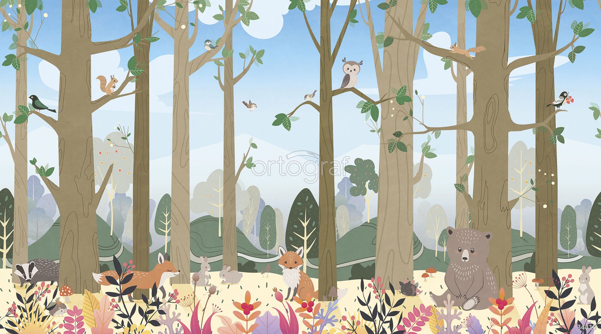 Сюжет иллюстрирует лесную сцену с деревьями, среди которых расположились медведь, лисы, зайцы, барсук, белки и различные птицы. Фоновый пейзаж дополняют холмы и растительный покров, что создает атмосферу уюта, спокойствия и гармонии с природой. Такой рисунок подойдет для помещений, где ценится тепло, мягкость и природные мотивы.