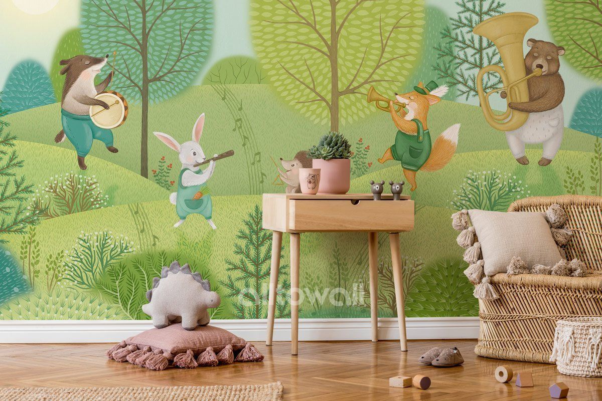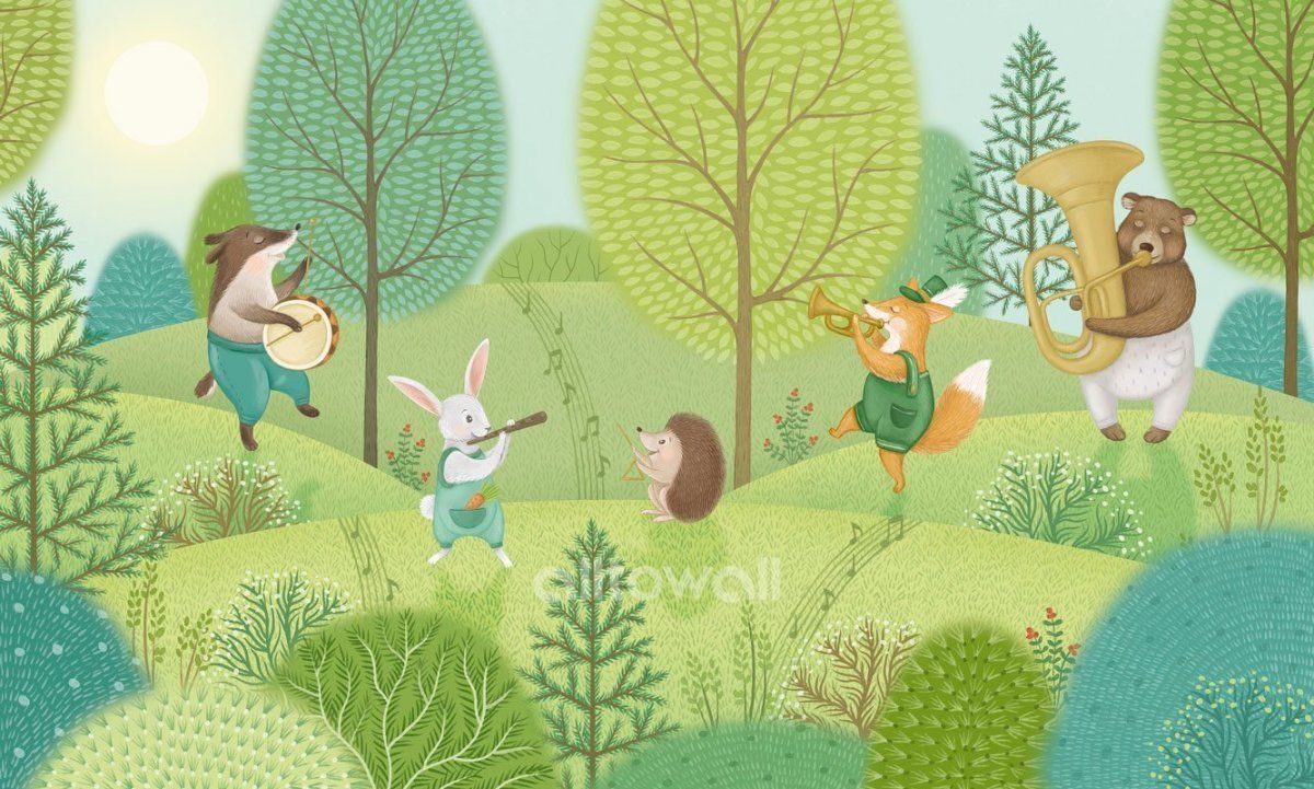 Яркие обои для детской комнаты с очаровательными зверятами на лесной опушке.