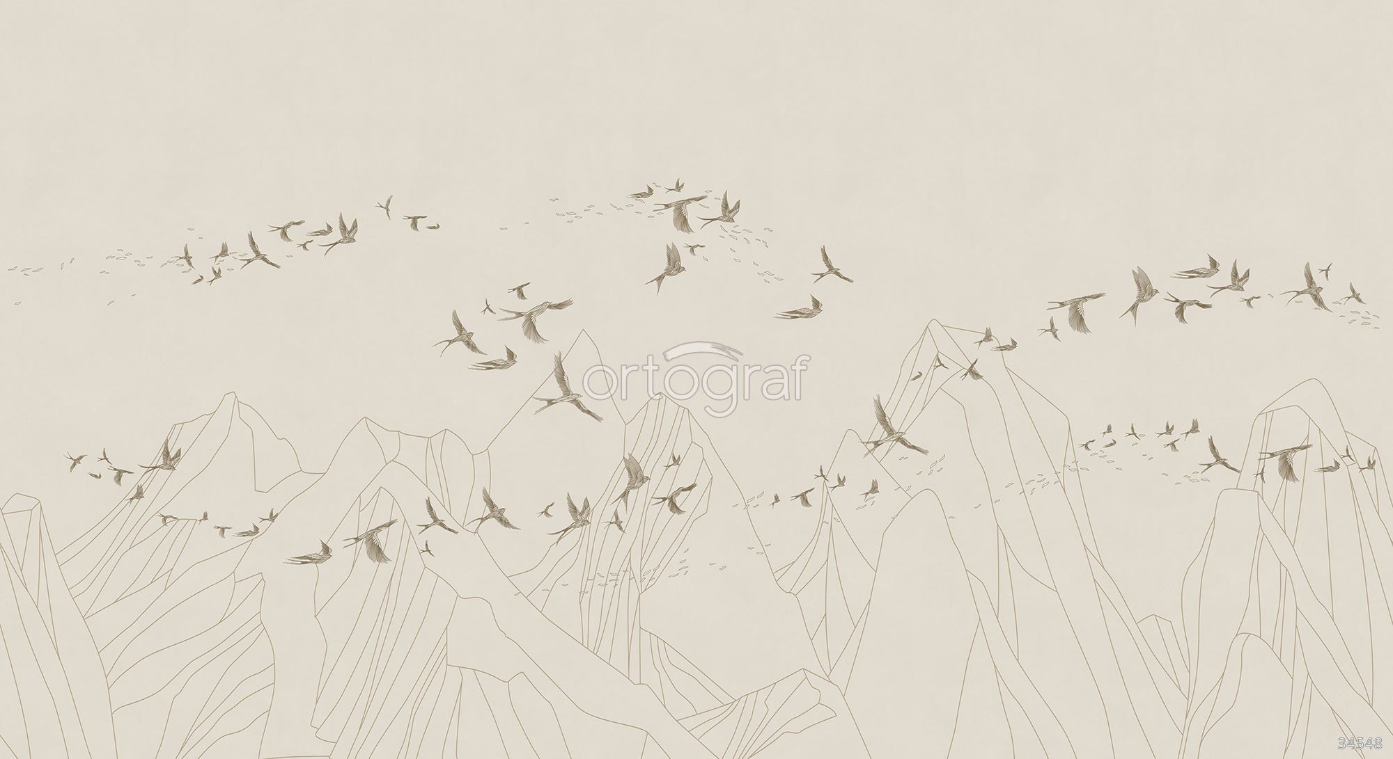 Лаконичный рисунок с горными линиями и стаей летящих птиц придаёт помещению ощущение лёгкости, свободы и воздушности. Такой сюжет прекрасно сочетается с современными спокойными интерьерами, добавляя ощущение открытого пространства и гармонии. Изображение подходит для оформления зон отдыха, работы и творчества, где ценится спокойная и умиротворяющая атмосфера.