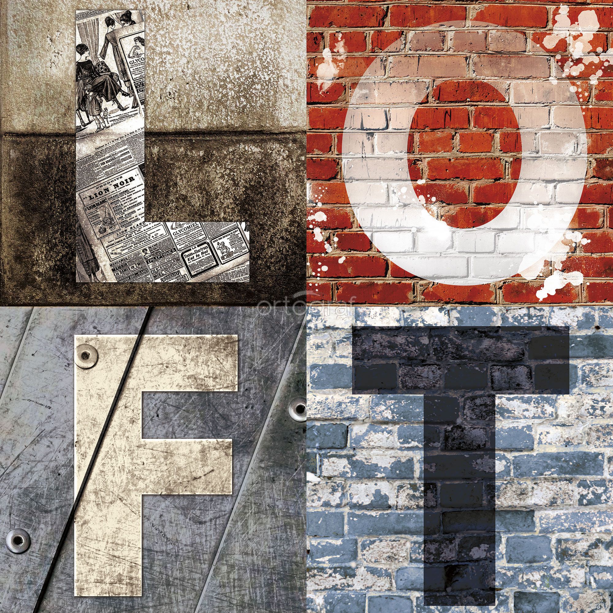Сюжет выполнен в урбанистическом стиле: композиция из четырёх секций с буквами, каждая оформлена в индустриальной или граффити-манере, на фоне кирпича, металла и газетных вырезок. Такой дизайн акцентирует характер пространства, добавляя ему стиль и динамику современного лофта. Лучше всего подходит для интерьеров, оформленных в индустриальном или городском стиле.