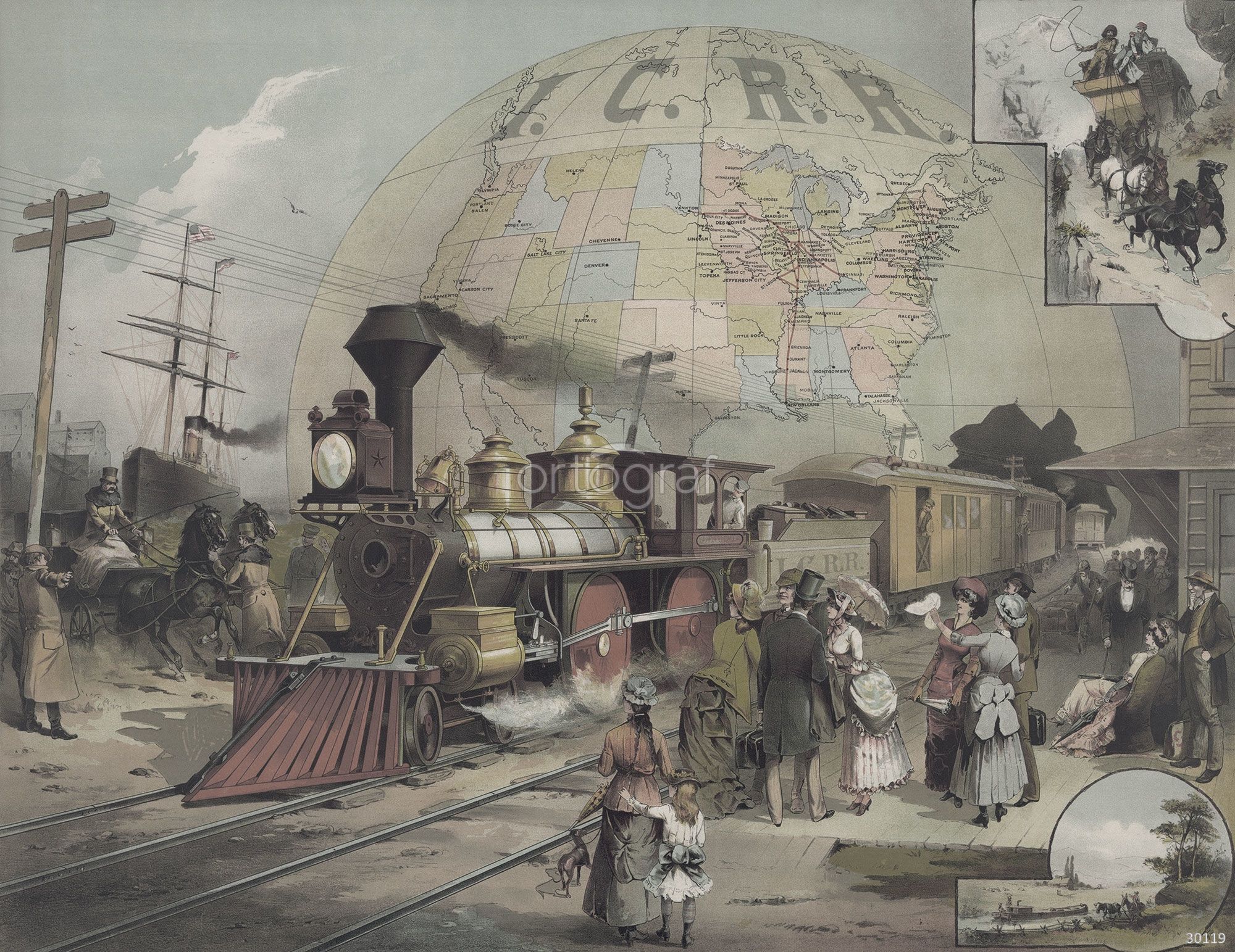 На картине изображён символический момент создания трансконтинентальной железной дороги: на первом плане паровоз встречает толпу пассажиров на вокзале, вокруг видны сцены из жизни XIX века — прибытие корабля, лошадиные упряжки, семьи и рабочие. На заднем плане огромный земной шар с картой Северной Америки и маршрутами железных дорог, что подчеркивает масштаб и значение развития железнодорожных перевозок для освоения континента и объединения территорий.