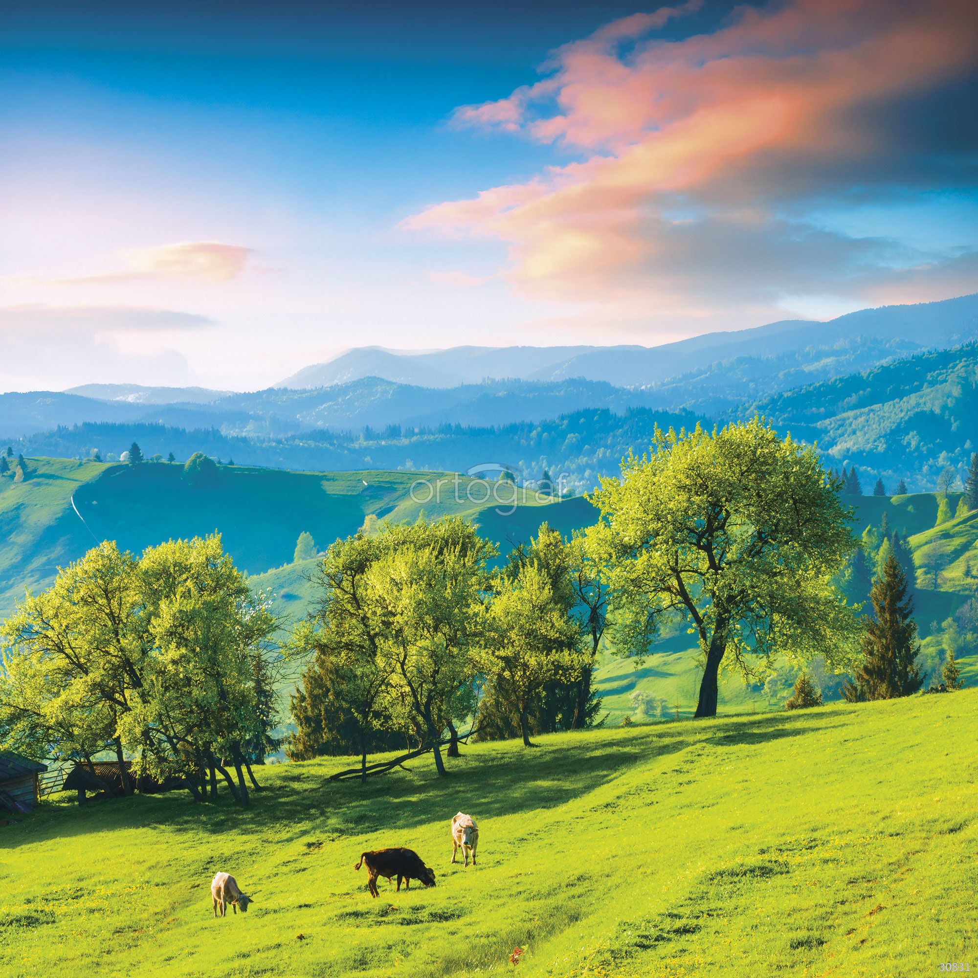 Пасторальный пейзаж с холмами, деревьями и пасущимися коровами на фоне гор создаёт атмосферу покоя, естественности и гармонии с природой. Такой сюжет наполняет интерьер уютом, расслабляет и визуально расширяет пространство.