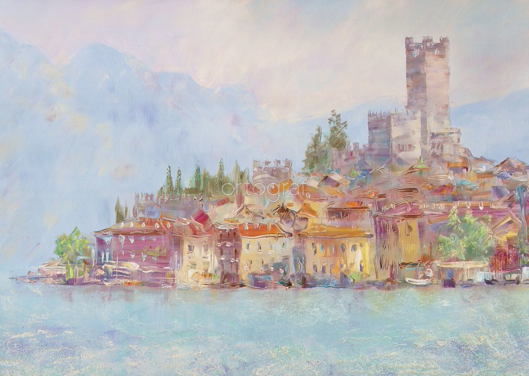 Картина с уютным прибрежным городком и средневековыми башнями на фоне гор передаёт атмосферу путешествия и спокойствия Такой сюжет наполняет интерьер нотками истории, гармонии и вдохновения, акцентируя внимание на уникальности европейской архитектуры у воды Отлично подойдёт для жилых помещений и зон отдыха, где важны эстетика и расслабление