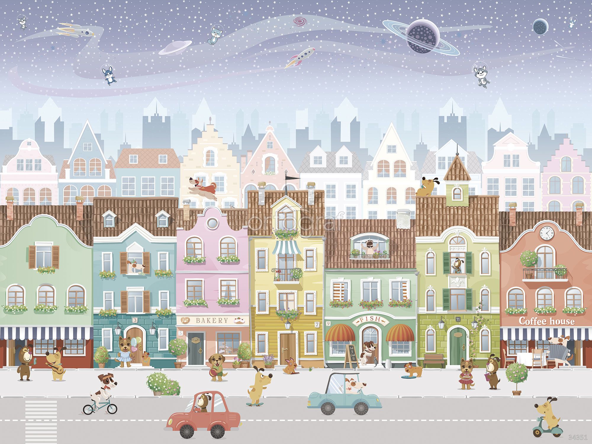 На рисунке изображен сказочный городской пейзаж с забавными зверятами, играющими и катающимися на транспорте, воздушными шарами и архитектурой изломанных домиков. Иллюстрация создает атмосферу путешествия, жизни и радости, привносит динамику и позитивное настроение. Такой сюжет отлично подойдет для оформления пространства, где желательны мечтательность и вдохновение. Особенно удачно этот сюжет будет смотреться в помещениях, где важна поддержка творческого и игрового начала.
