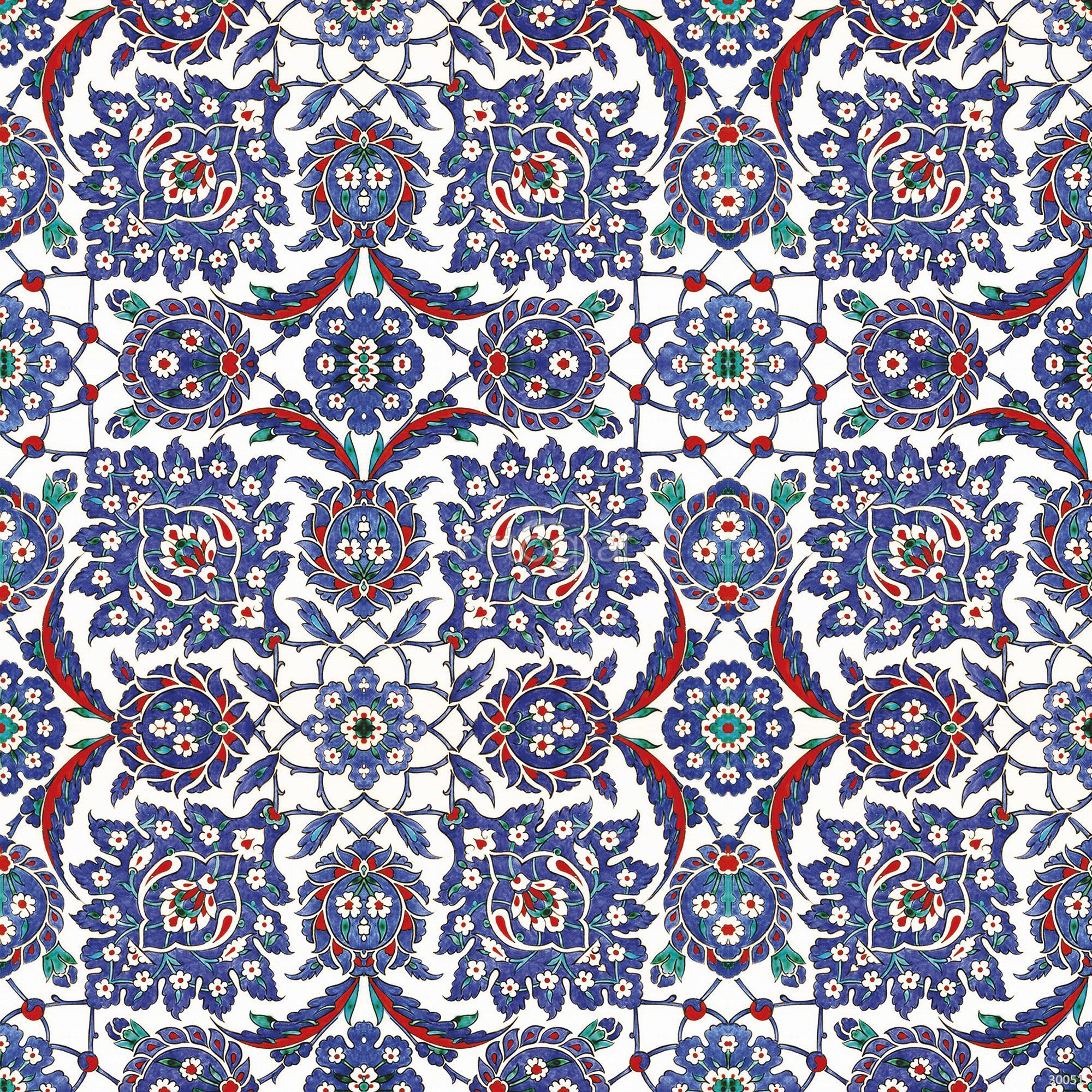 Традиционный восточный орнамент с растительными мотивами, выполненный в насыщенных синих, красных и зелёных оттенках. Симметричный узор построен на стилизованных цветах и завитках, напоминая классические турецкие или персидские изразцы и керамику. Композиция создаёт ощущение гармонии и декоративного восточного изящества.