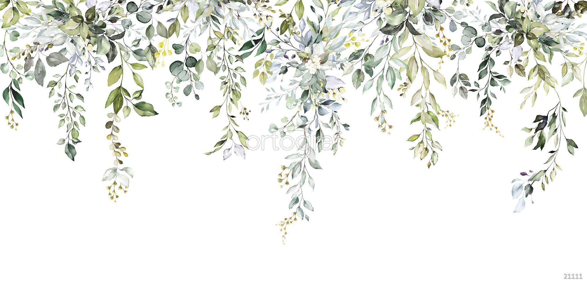 Изящная гирлянда из листьев и ветвей, собранная в плотные спадающие каскады, формирует декоративное убранство верхней части пространства. Композиция сочетает разнообразные формы листвы, создавая ощущение лёгкости, природы и ботанической гармонии.