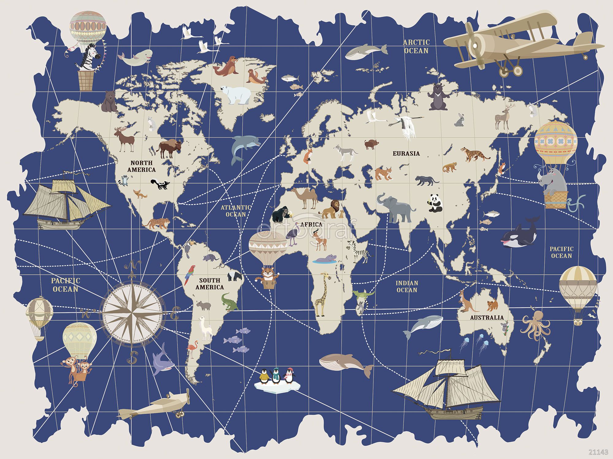 Иллюстрированная карта мира, украшенная изображениями животных, птиц и морских обитателей, соответствующих разным континентам и океанам. По поверхности карты размещены воздушные шары, старинные корабли, самолёты и компас, что создаёт атмосферу путешествий, исследований и знакомства с природой планеты.