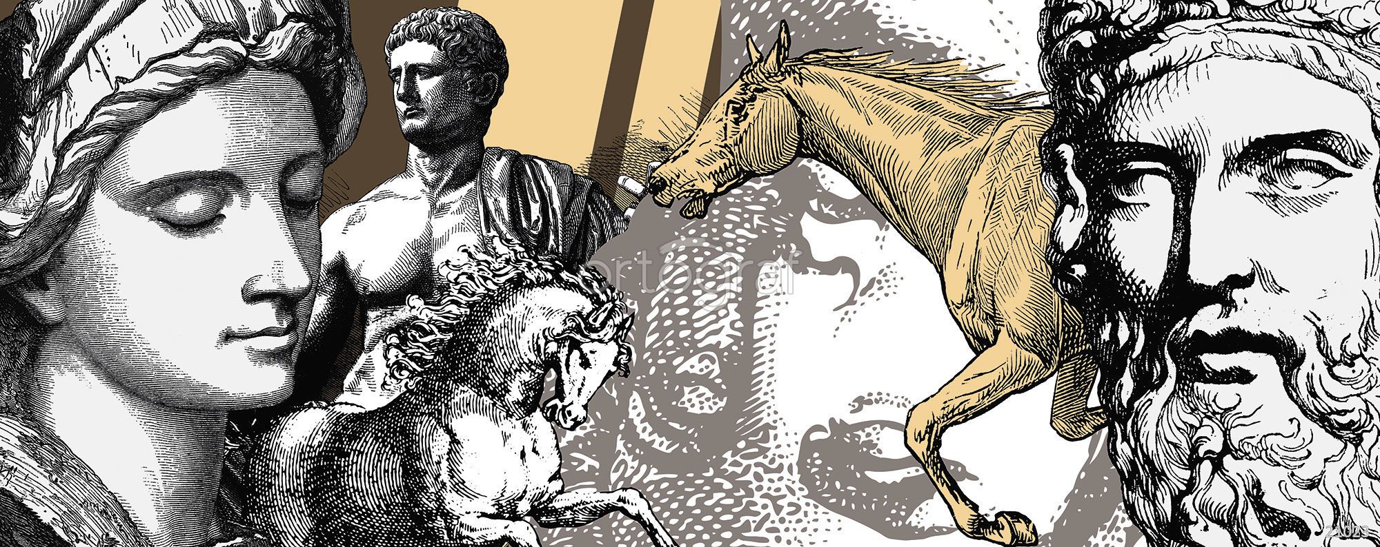 Классические статуи и гравюры в античном стиле сочетаются с изображениями лошадей и фрагментами человеческих фигур, создавая динамичную композицию в духе древнегреческих и римских мифологических сцен. На фоне видны детали, напоминающие античные барельефы и узоры, что придаёт работе атмосферу истории, величия и художественной экспрессии.