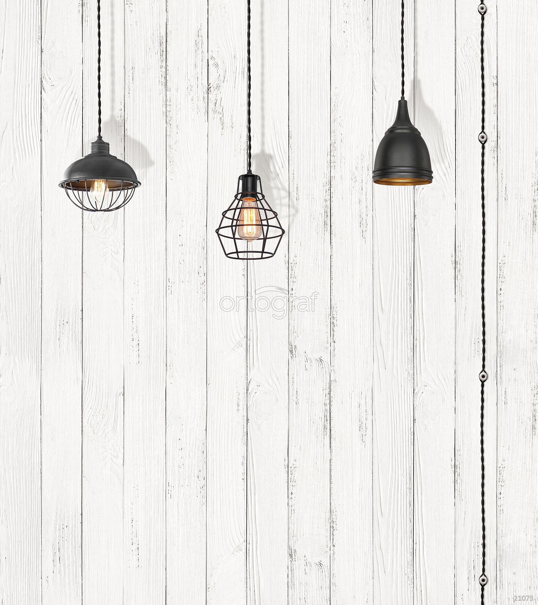 Три стильных подвесных светильника с металлическими абажурами и декоративными проводами сформированы в ряд на фоне деревянной стены. Центральный светильник выполнен в виде геометрического плафона, подчёркивающего современный и одновременно индустриальный характер интерьера. Композиция навевает ощущение уюта, минимализма и лофтового стиля.