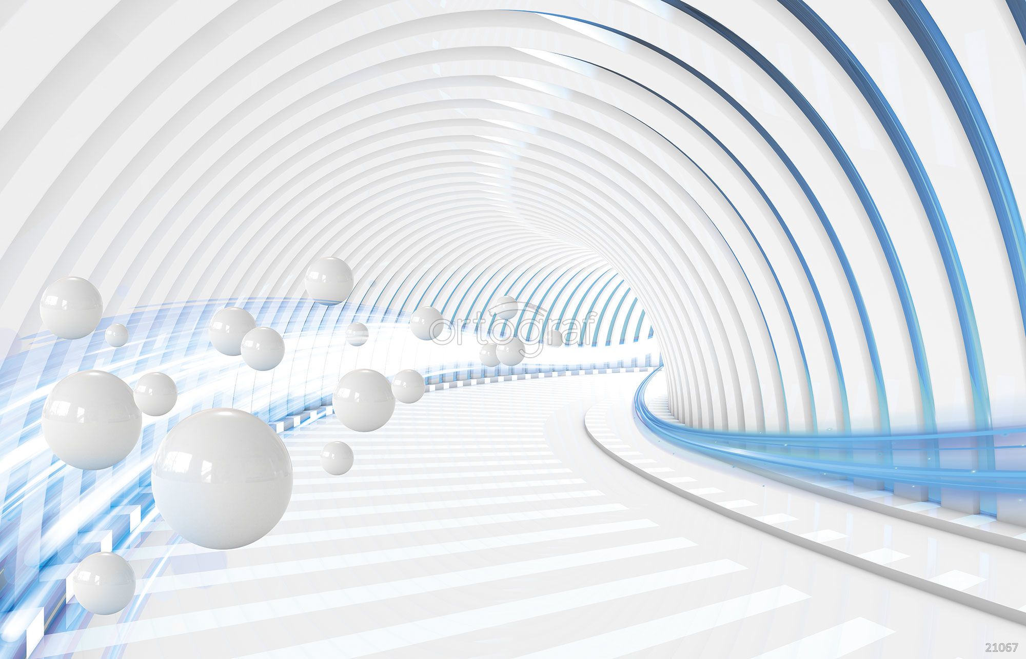Визуализация футуристического тоннеля с изогнутыми арками и плавными линиями, где пространственная перспектива уходит вдаль. Вдоль изогнутых стен парят глянцевые сферы разного размера, создавая ощущение движения и технологичности. Общая композиция ассоциируется с динамикой, инновациями и цифровым пространством.