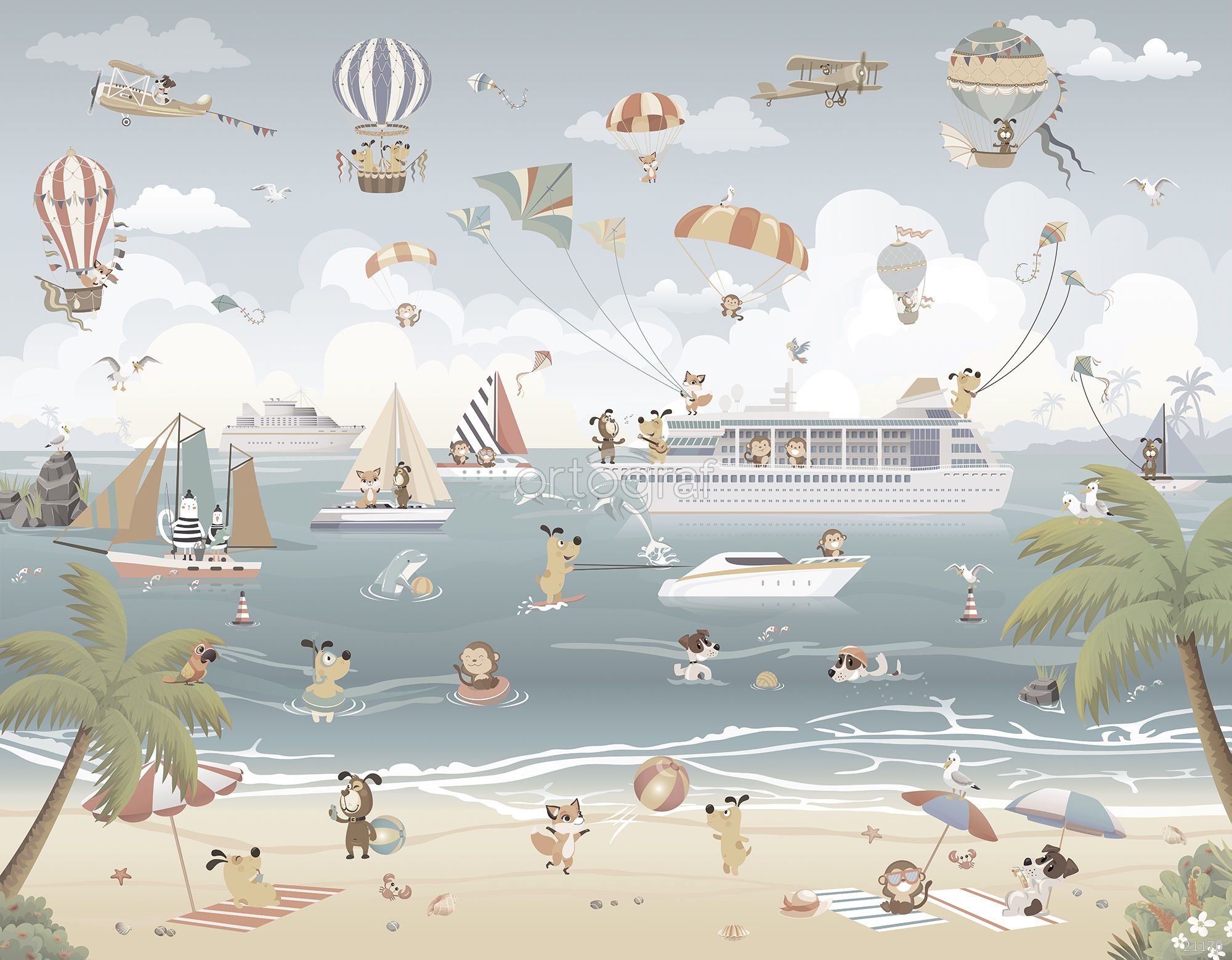 Иллюстрированная композиция изображает оживлённую прибрежную сцену с множеством животных, которые отдыхают, купаются, катаются на лодках, запускают воздушных змеев и воздушные шары, а также путешествуют на круизном лайнере. В сцене сочетаются элементы пляжного досуга, водных видов спорта и парашютного развлечения, а вокруг царит атмосфера радости, лета и активного отдыха.