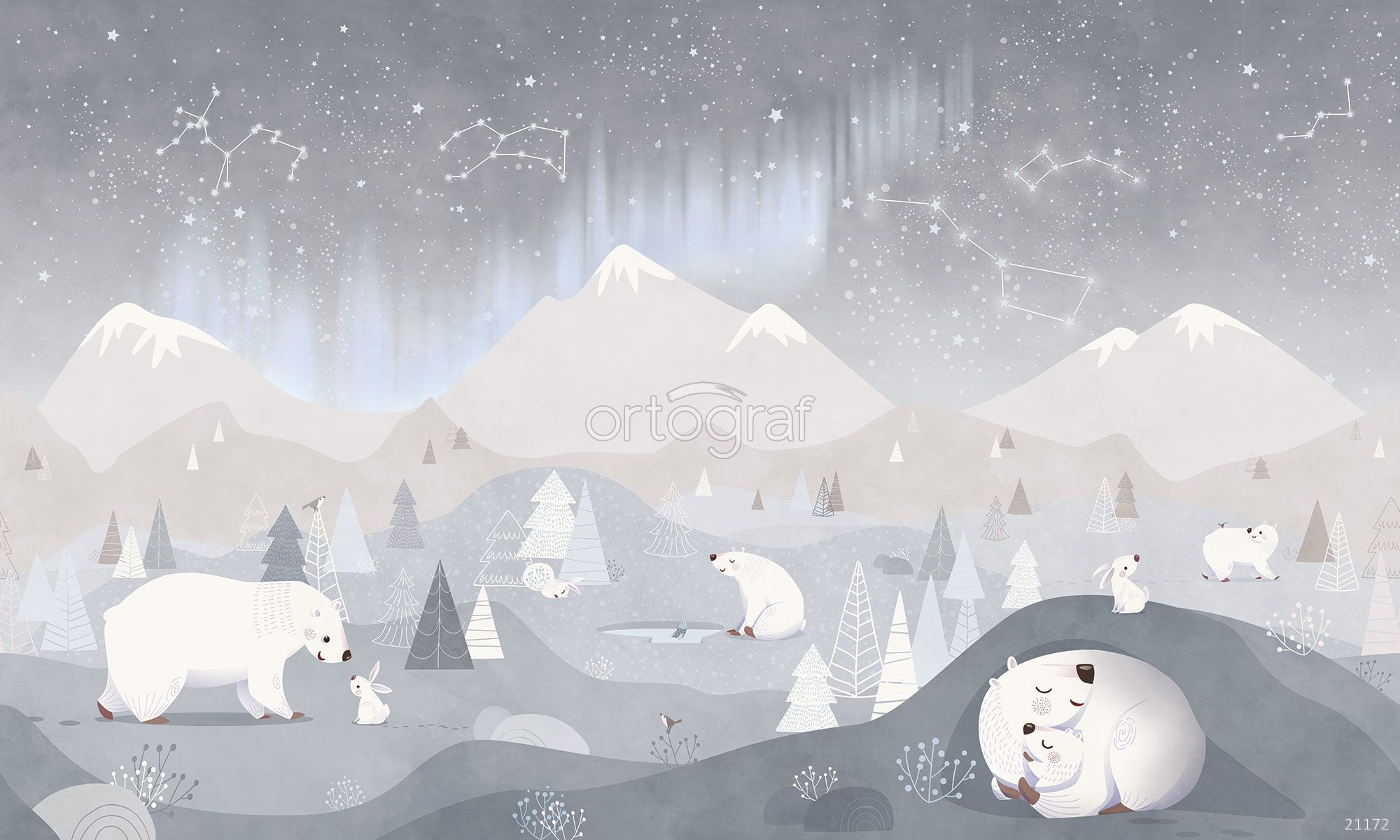 Сюжетные обои изображают идиллическую арктическую природу: несколько полярных медведей, играющих, отдыхающих и заботящихся о детёнышах среди холмов, снежных гор и лесных деревьев. Над ними раскинулось ночное небо с созвездиями и мерцающим северным сиянием, создавая атмосферу сказочности, уюта и гармонии дикой природы.