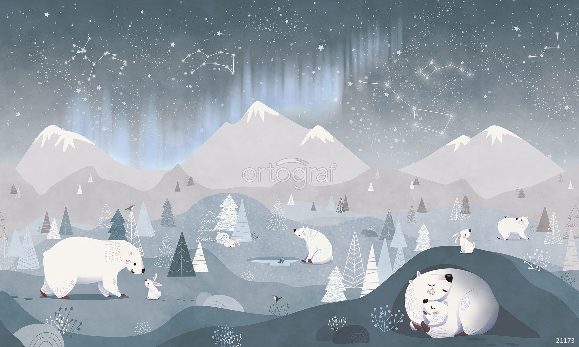 Сюжетные обои изображают идиллическую арктическую природу: несколько полярных медведей, играющих, отдыхающих и заботящихся о детёнышах среди холмов, снежных гор и лесных деревьев. Над ними раскинулось ночное небо с созвездиями и мерцающим северным сиянием, создавая атмосферу сказочности, уюта и гармонии дикой природы.