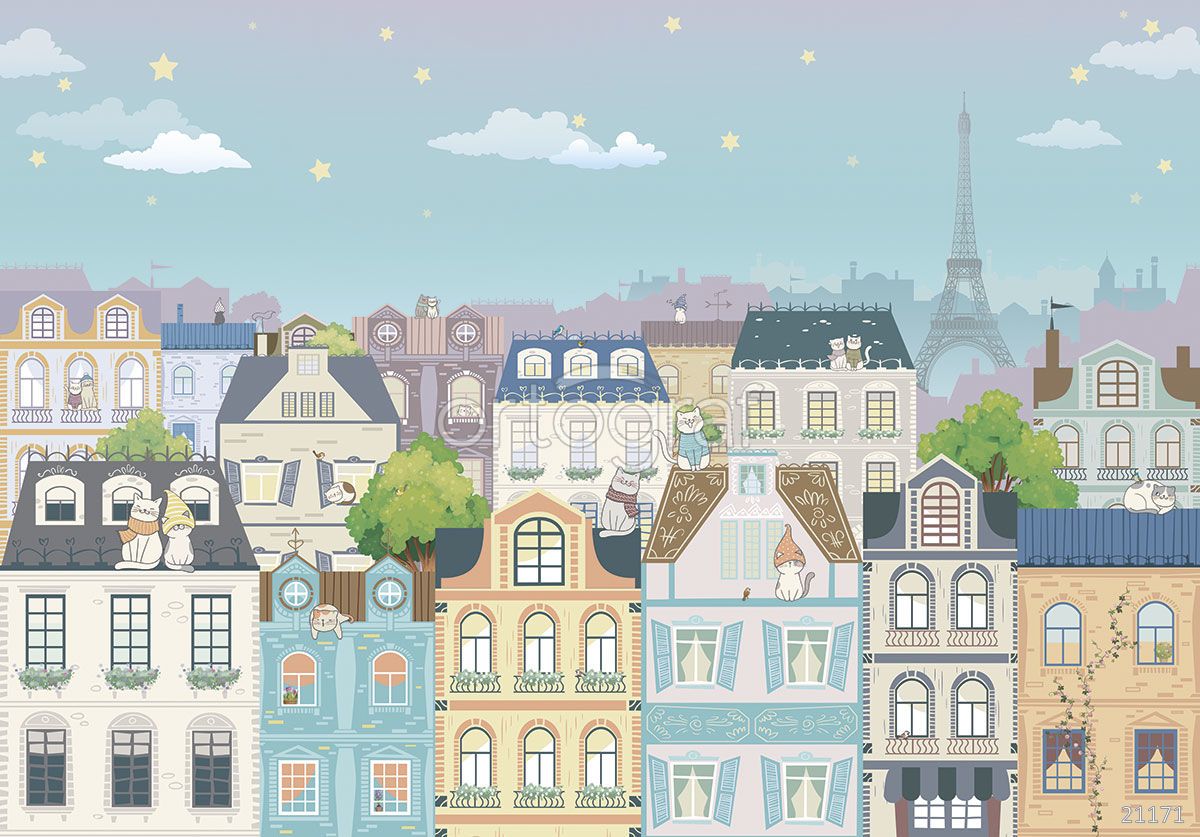 Иллюстрированная городская панорама с фантазийными домами и множеством кошек, которые сидят на крышах, балконах и у окон, создаёт атмосферу уюта и сказочного настроения. Вдалеке узнаётся силуэт Эйфелевой башни, подчёркивающей парижский шарм и лёгкость этого воображаемого города с яркими деталями. Композиция подойдёт для создания игровой, дружелюбной атмосферы в детской комнате.