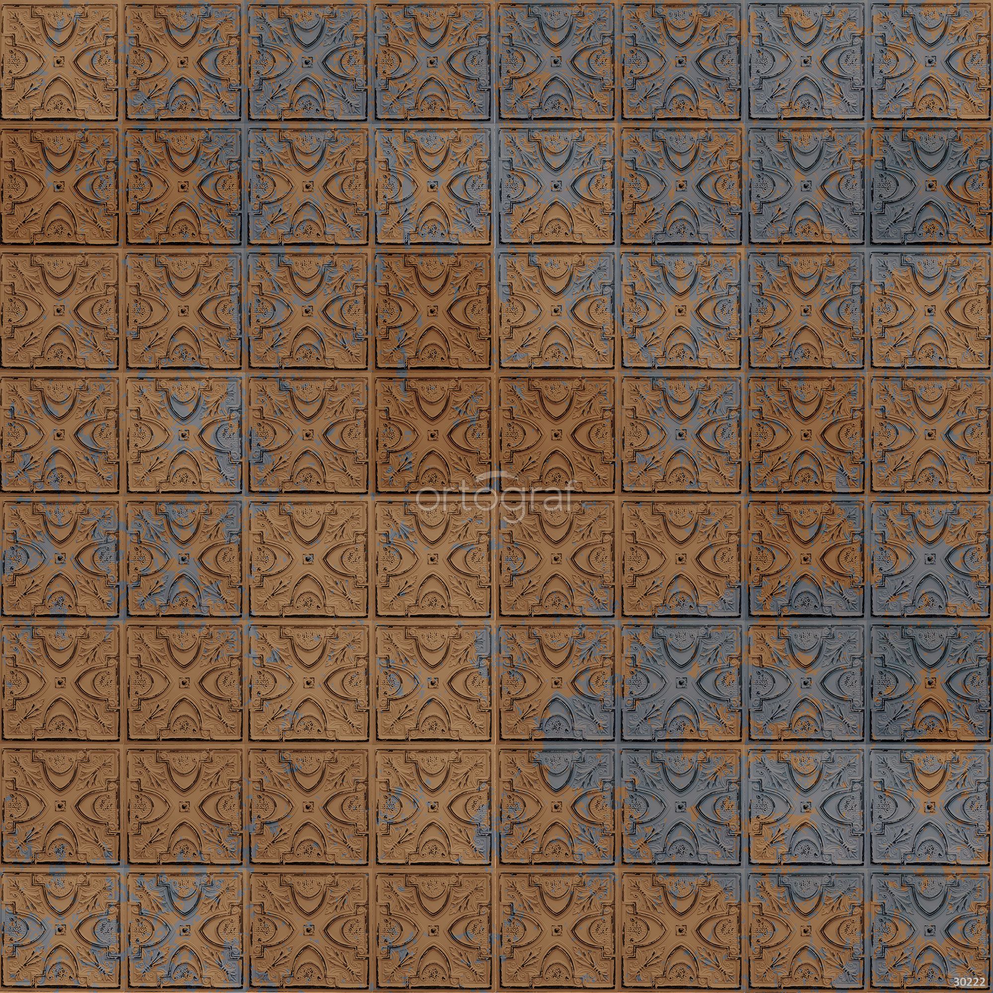 На изображении представлен декоративный узор из квадратных плит с рельефным орнаментом, выполненных под старую медную или терракотовую плитку. Часть узора покрыта патиной или тёмно-синим налётом, создающим эффект состаренности и искусственного износа. Композиция складывается в строгую прямоугольную сетку, акцентируя внимание на повторяемости мотивов и контрасте между очищенными и окисленными участками.