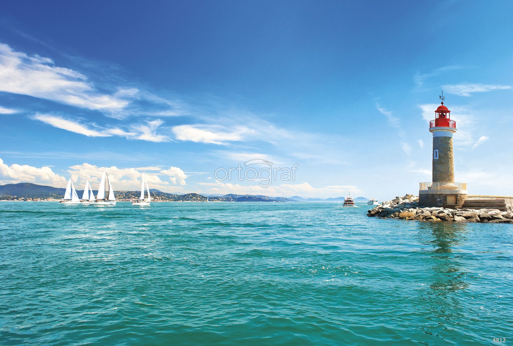 Пейзаж с маяком на берегу и парусниками на морской глади создает атмосферу легкости и стремления к путешествиям, отлично подойдет для оформления помещений с расслабляющей или вдохновляющей обстановкой. Такой сюжет хорошо смотрится в интерьерах, где важна гармония и ощущение открытого пространства. Изображение подойдет для современных жилых и рабочих зон, а также мест, где ценится морская тематика.