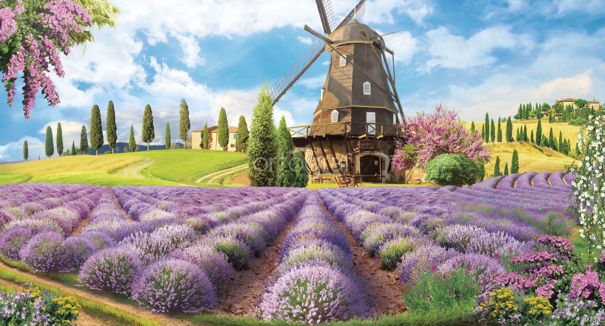 Яркий загородный пейзаж с полем лаванды, ветряной мельницей и деревьями создает ощущение простора, свежести и умиротворения. Такое изображение визуально расширяет помещение и наполняет его природной гармонией и атмосферой сельской идиллии.
