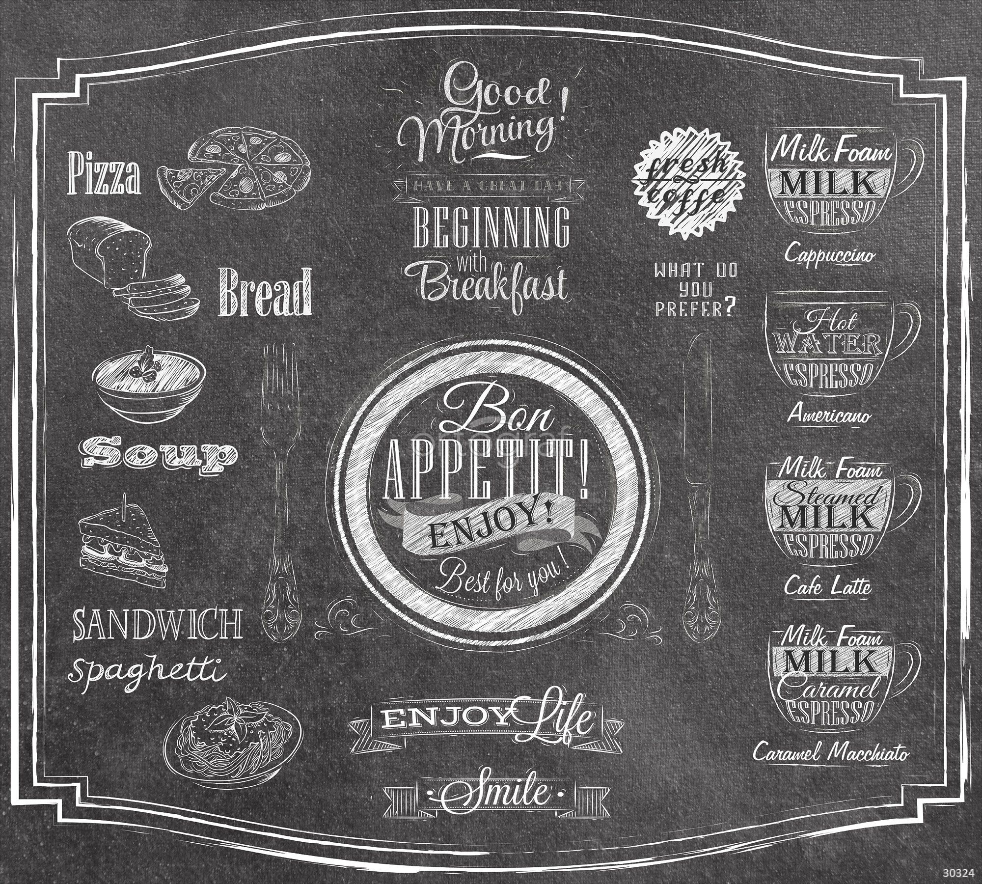 Изображение выполнено в стилистике декоративной доски-меню с коллекцией кофейных напитков, блюд и позитивных надписей. Можно увидеть иллюстрированные наглядные подписи к напиткам (капучино, латте, американо, карамельный маккиато), блюдам (пицца, хлеб, суп, сэндвич, спагетти) и мотивирующие пожелания вроде "Bon Appetit!", "Good morning", "Enjoy life". Композиция оформлена в стиле старого кафе или кофейни, приглашая начать день с вкусного завтрака и свежего кофе.