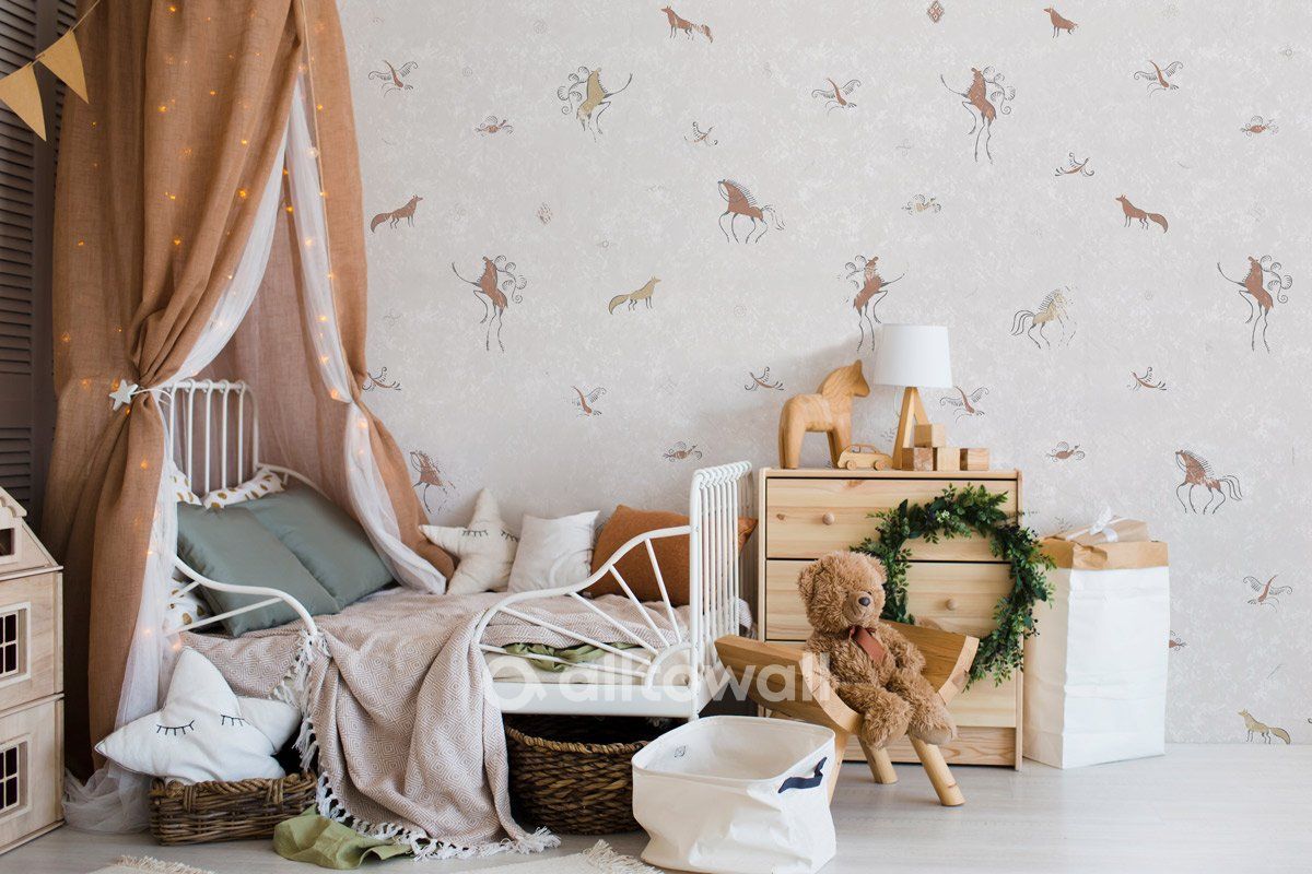 Главными персонажами мезенского декора всегда были лошади и олени. Мы взяли за основу этих персонажей, добавили лисичек и создали эти обои. Сюжет «Мезенская сказка-1» в тёплых оттенках может стать украшением детской или спальни.
