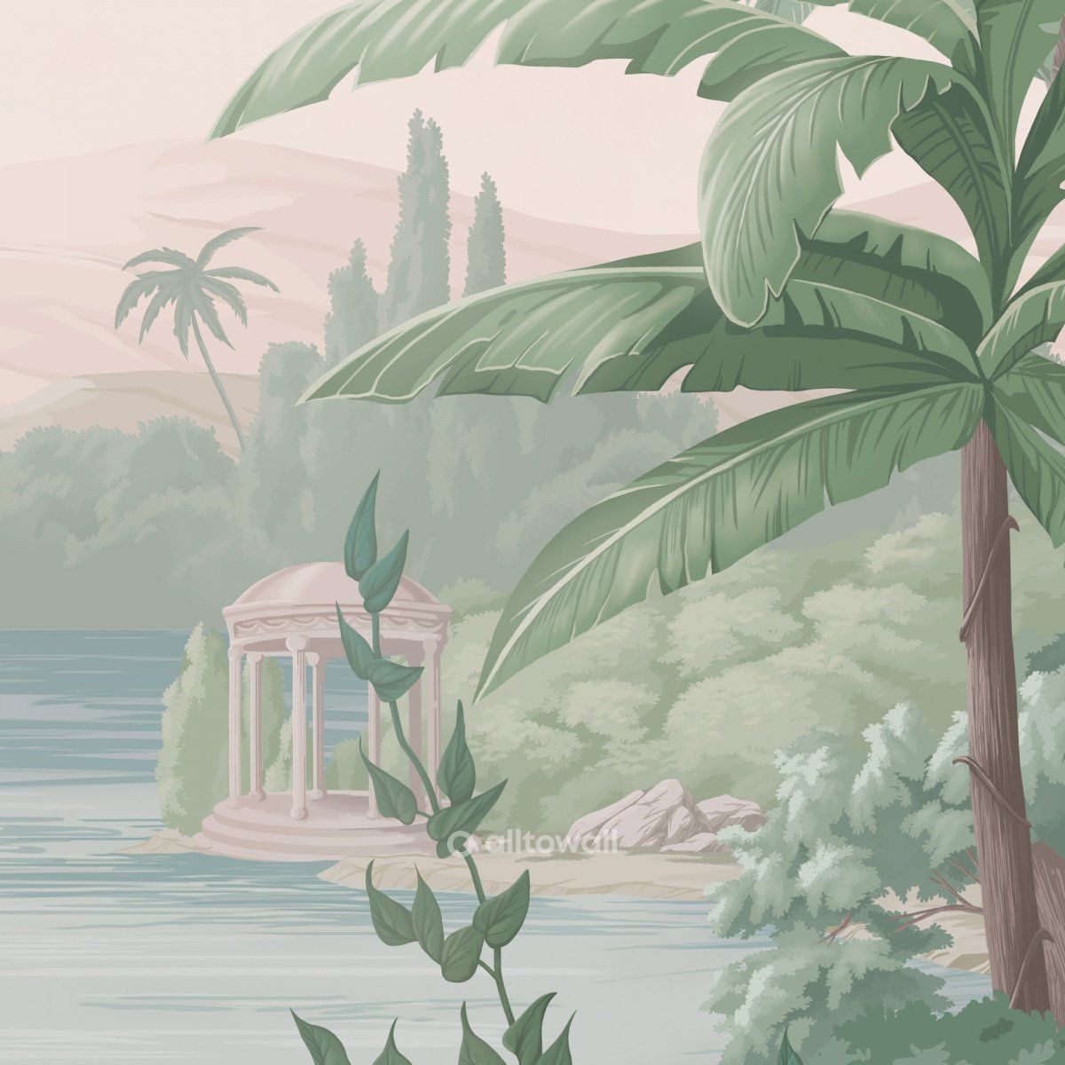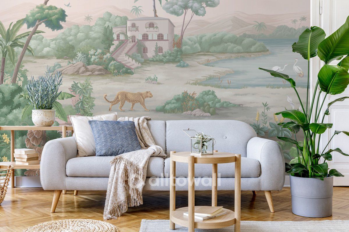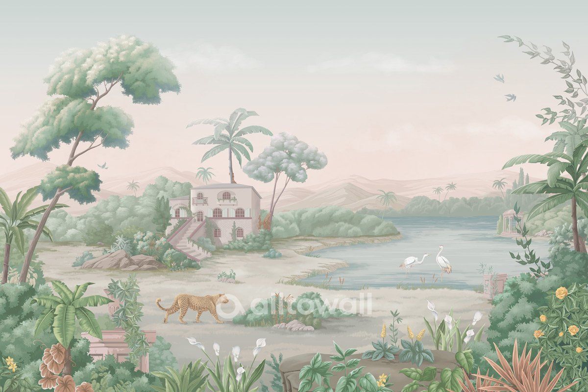 Мираж — прекрасное видение цветущего оазиса посреди пустыни, появляющееся перед путешественником. Здесь есть всё, что можно пожелать: прохладное озеро, горы в нежно-розовой дымке, тропические джунгли, дающие тень. Пейзаж дополняют грациозный леопард и озёрные цапли. Обои «Мираж» — универсальное решение и для гостиной, и для спальни, и для детской «на вырост»