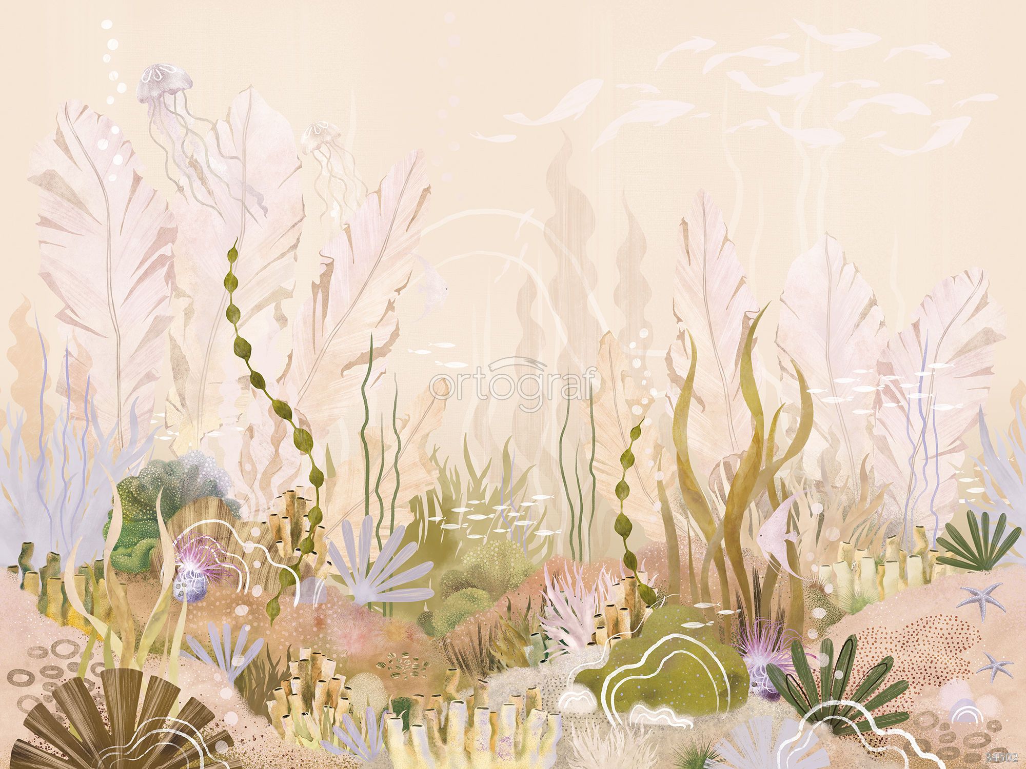 Подводный мир с водорослями, медузами и морскими существами создаёт ощущение глубины и лёгкости, добавляя интерьеру атмосферу свежести и спокойствия. Такой сюжет гармонично впишется в помещения для отдыха или уединения, помогая расслабиться и представить себя на морском дне. Идеально подходит для создания ненавязчивого, но эффектного акцента в современном интерьере.