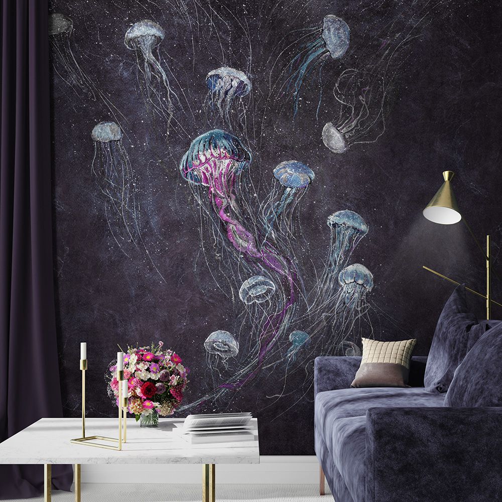 MYSTERY – обои, посвященные наиболее загадочным обитателям морского дна. На призрачном фоне с едва уловимыми мазками резвится стайка медуз, щупальца которых переплетаются между собой, следуют за переменчивым течением. Такой вариант покрытий можно использовать для современного интерьера, для создания элементов морской тематики, создания необычного акцента.
