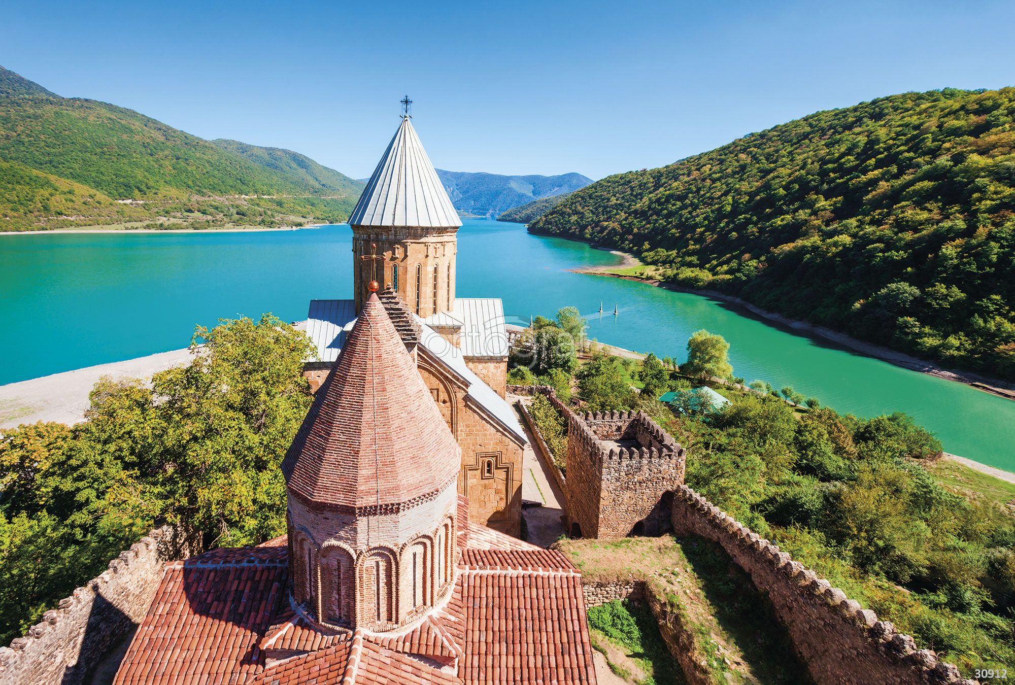 Величественный архитектурный ансамбль с древней крепостью и храмом, расположенный на берегу бирюзового водоема среди лесистых холмов. Панорамный вид создает атмосферу умиротворения и истории, наполняет интерьер ощущением устойчивости и красоты природы. Такой сюжет особенно подойдет для создания акцента в светлых и просторных помещениях.