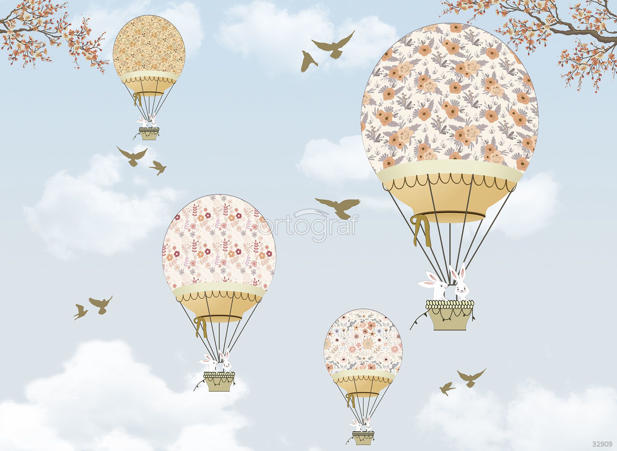 Нежный узор с воздушными шарами, в которых путешествуют милые зайцы, и пролетающими птицами на фоне облачного неба создает атмосферу сказки, уюта и безмятежности. Такой сюжет отлично украшает пространство для детей, вдохновляет на игровые фантазии и положительные эмоции. Особенно рекомендуется для детской комнаты.