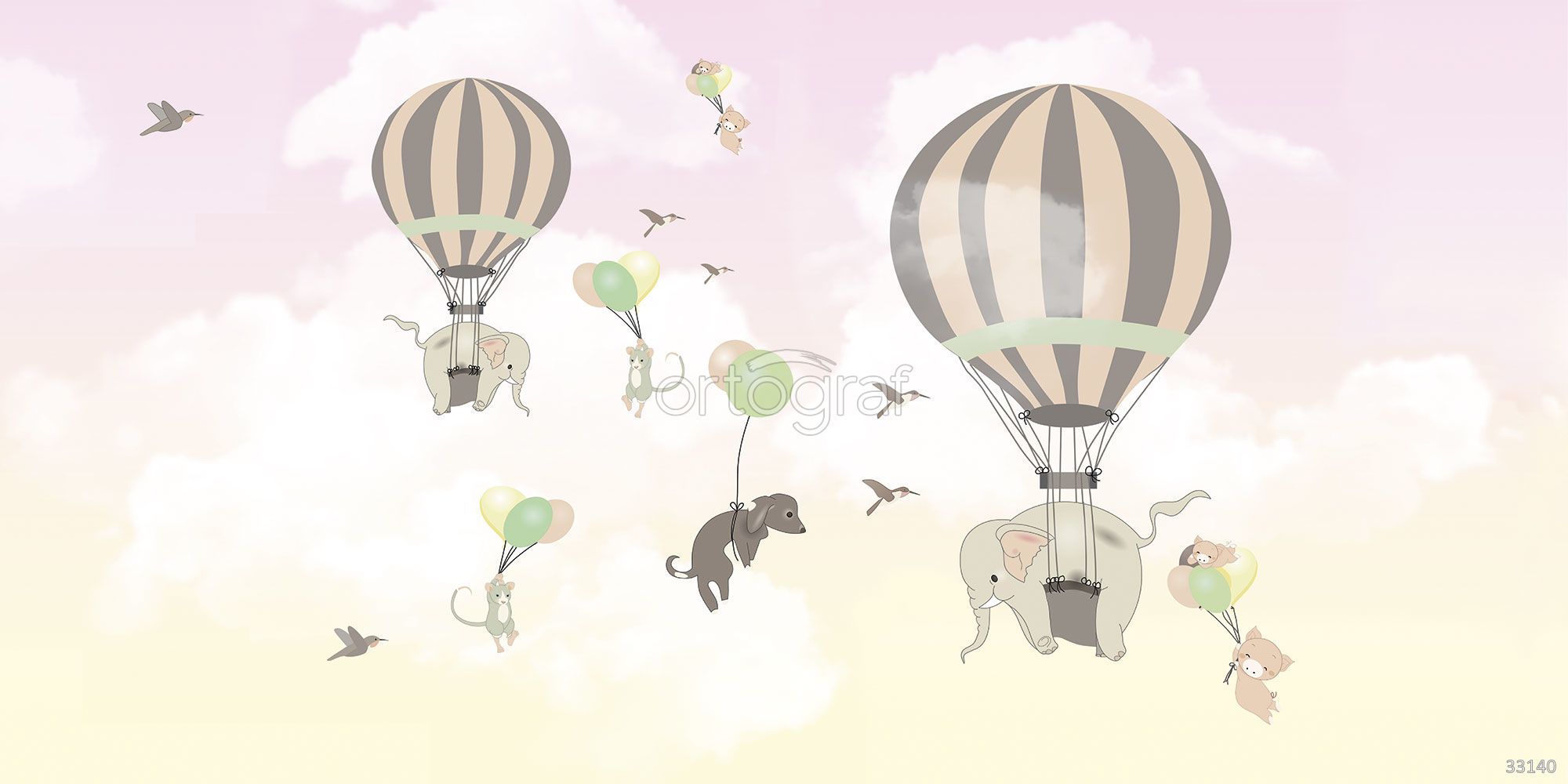 Забавные животные, путешествующие на воздушных шарах и воздушных шариках среди облаков и птиц, создают ощущение легкости и веселья. Иллюстрация наполняет пространство фантазией, пробуждая у детей интерес к приключениям и мечтам. Такой сюжет отлично подойдет для оформления веселой и дружелюбной атмосферы.