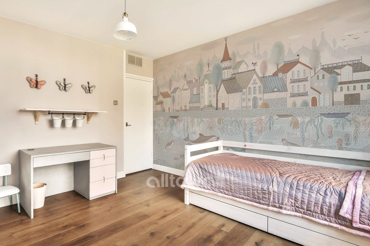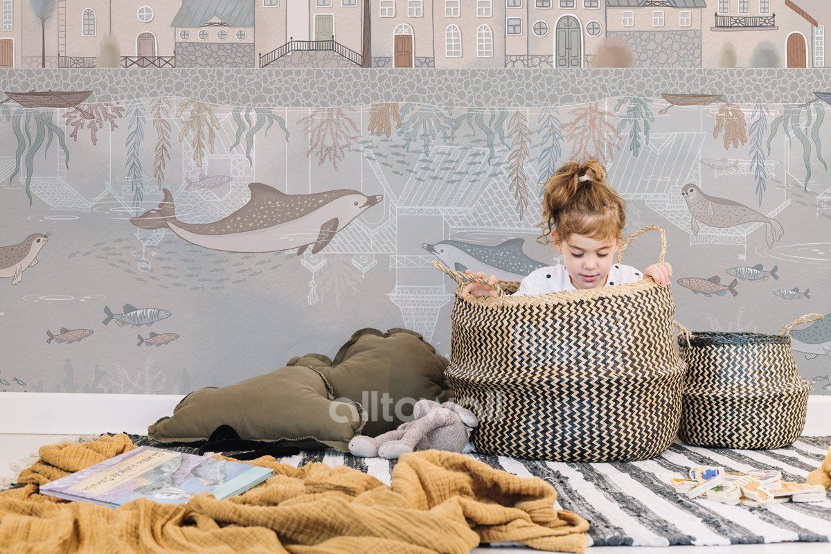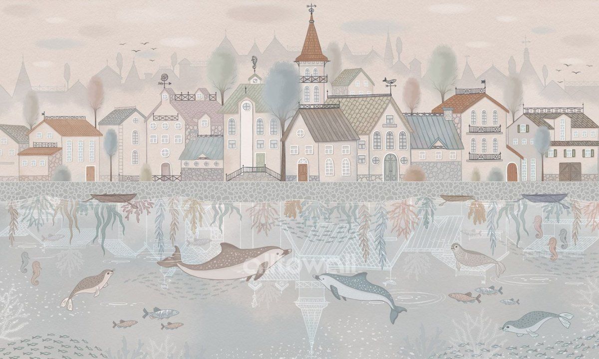 Набережная – обои для комнаты ребёнка, выполненные в пастельных оттенках и рассказывающие о жизни небольшого приморского городка. В верхней части покрытия изображена городская набережная с небольшими и уютными домами, лестницами, спускающимися прямо к воде. Но основной акцент сделан на морских обитателях – дельфинах, рыбках, морских котиках, резвящихся в воде.