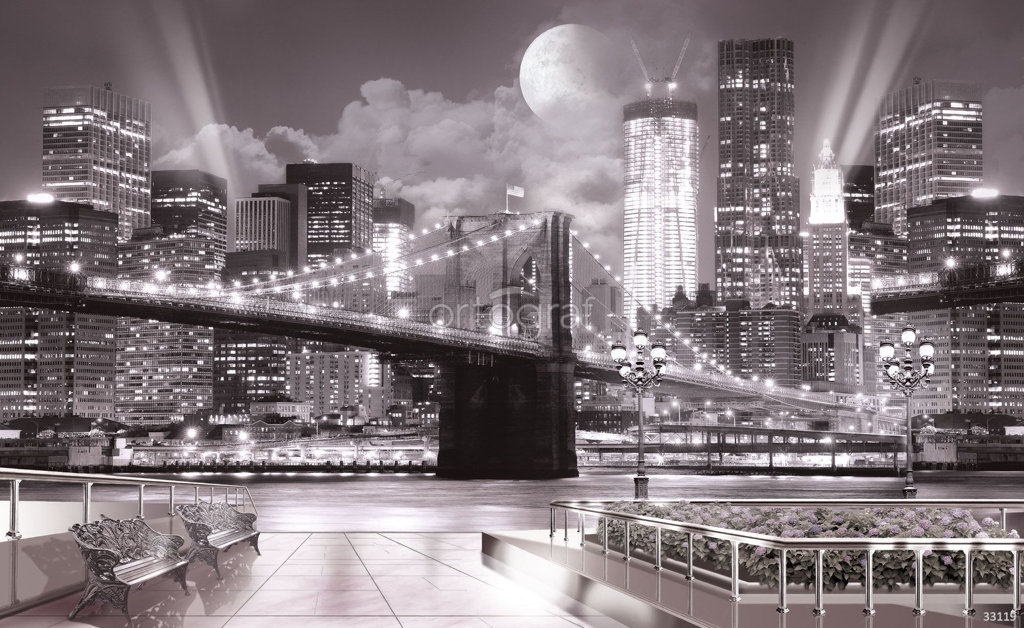 На изображении показан городской пейзаж мегаполиса ночью с освещённым мостом, высотными зданиями, полной луной и террасой с коваными скамейками на переднем плане. Атмосфера панорамы создаёт ощущение урбанистической романтики, динамики и современной эстетики. Такой сюжет хорошо впишется в современный интерьер, добавит акцент на стиль и пространство.