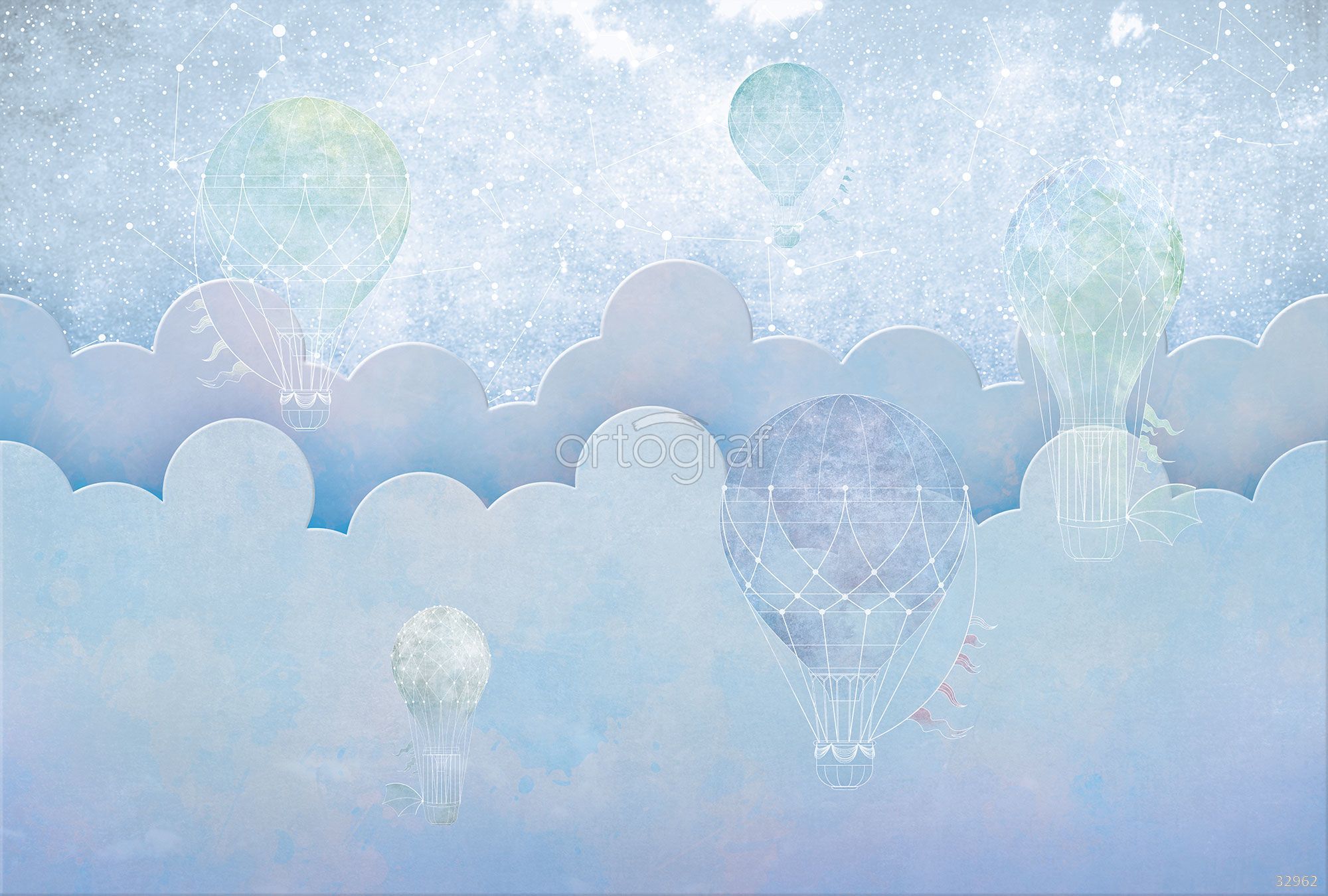 На изображении изображены воздушные шары, плывущие сквозь слоистые облака на фоне звёздного неба и созвездий. Иллюстрация создаёт ощущение лёгкости, мечтательности и воздушной сказки, наполняет пространство атмосферой спокойствия. Такой сюжет идеально подойдёт для детской, а также будет уместен в спальне.