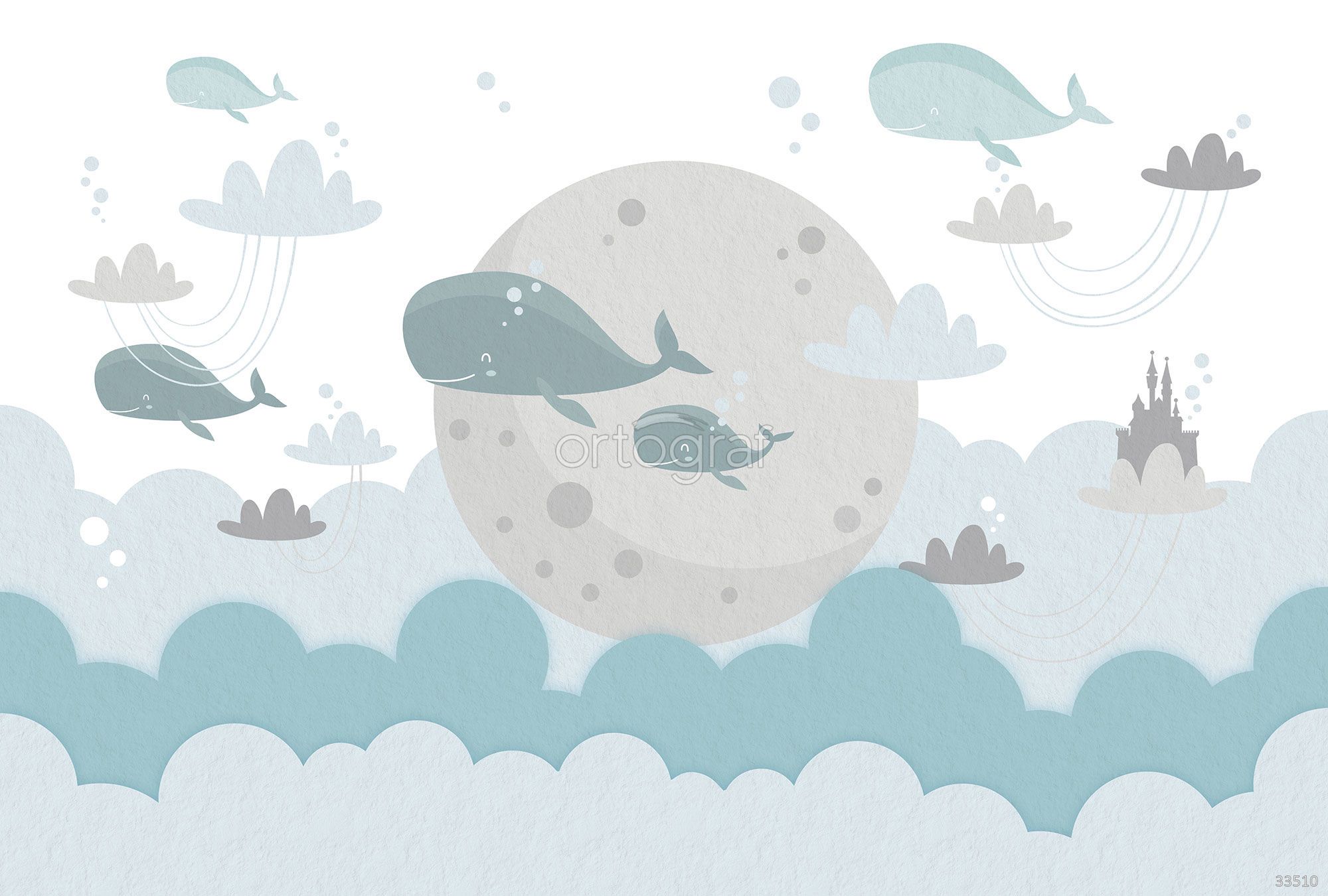 Милый и сказочный сюжет с летающими китами, облаками, пузырьками и замком на фоне луны создает атмосферу фантазии, покоя и уюта. Такой рисунок идеально подходит для детской, делая пространство волшебным и вдохновляющим для игр и творчества. Легкие мотивы способствуют расслаблению и развитию воображения.