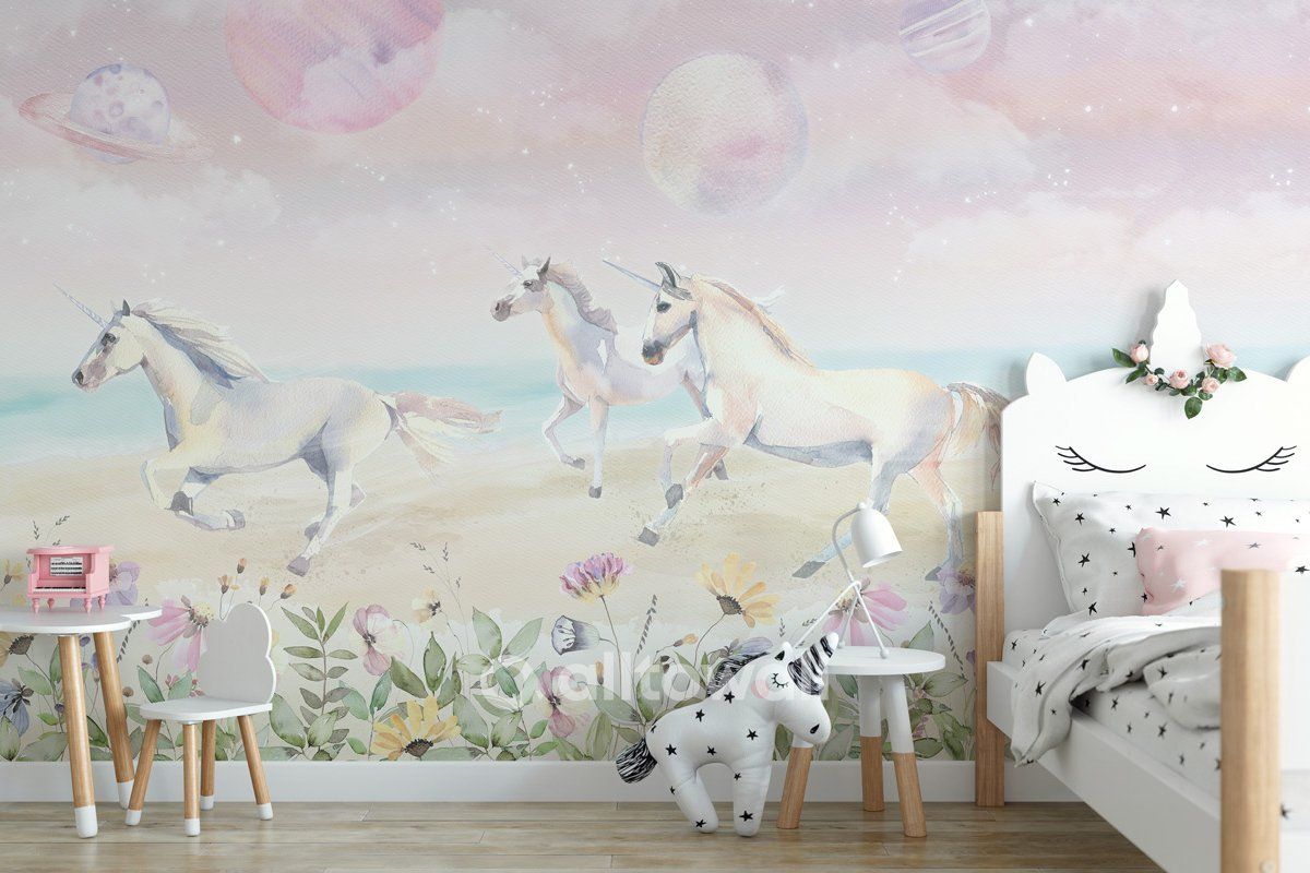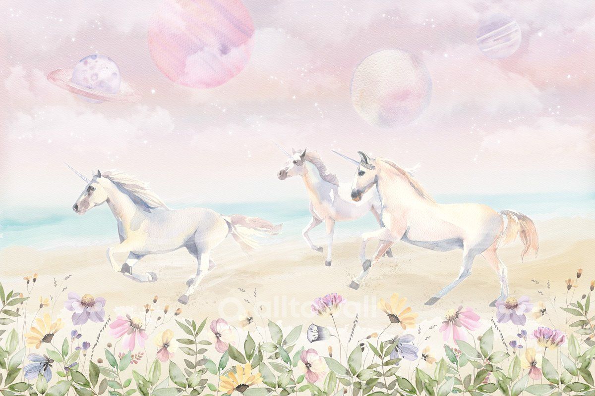 Обои «Наперегонки с ветром» посвящена грациозным единорогам. Эти животные словно вышли из сказки, пересекая равнину под светом звёзд и лун другого мира. Мягкие оттенки, пастельная палитра и особая техника рисунка делают покрытие лучшим вариантом для оформления комнаты ребёнка от 2-3 лет. Рисунок можно использовать для фонового декора или выделения участка.