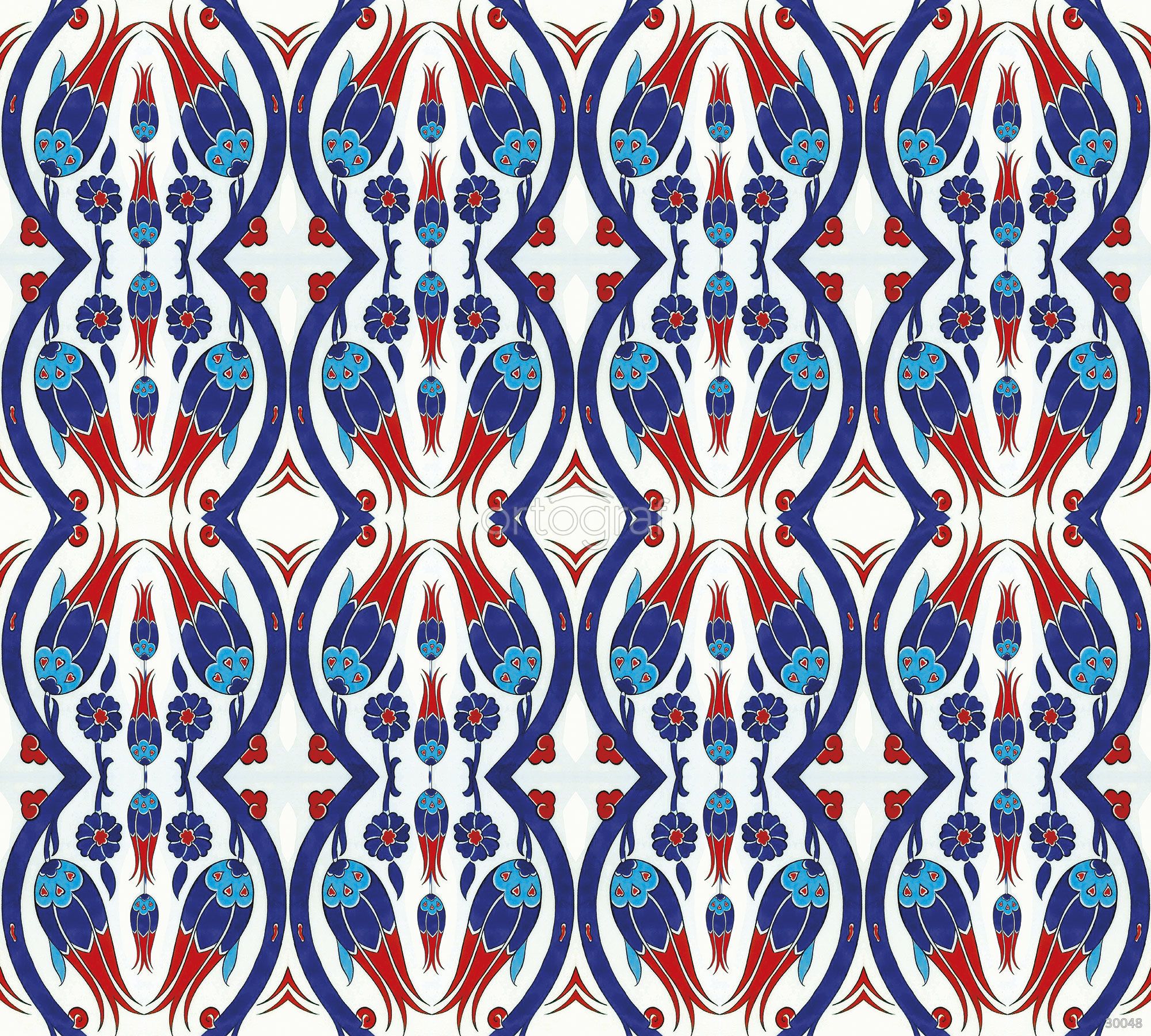 Традиционный восточный орнамент с растительными мотивами, выполненный в насыщенных оттенках синего, бирюзового и красного. Симметричный узор основан на стилизованных цветах, напоминающих тюльпаны и гвоздики, а плавные линии придают композиции динамику и гармонию.