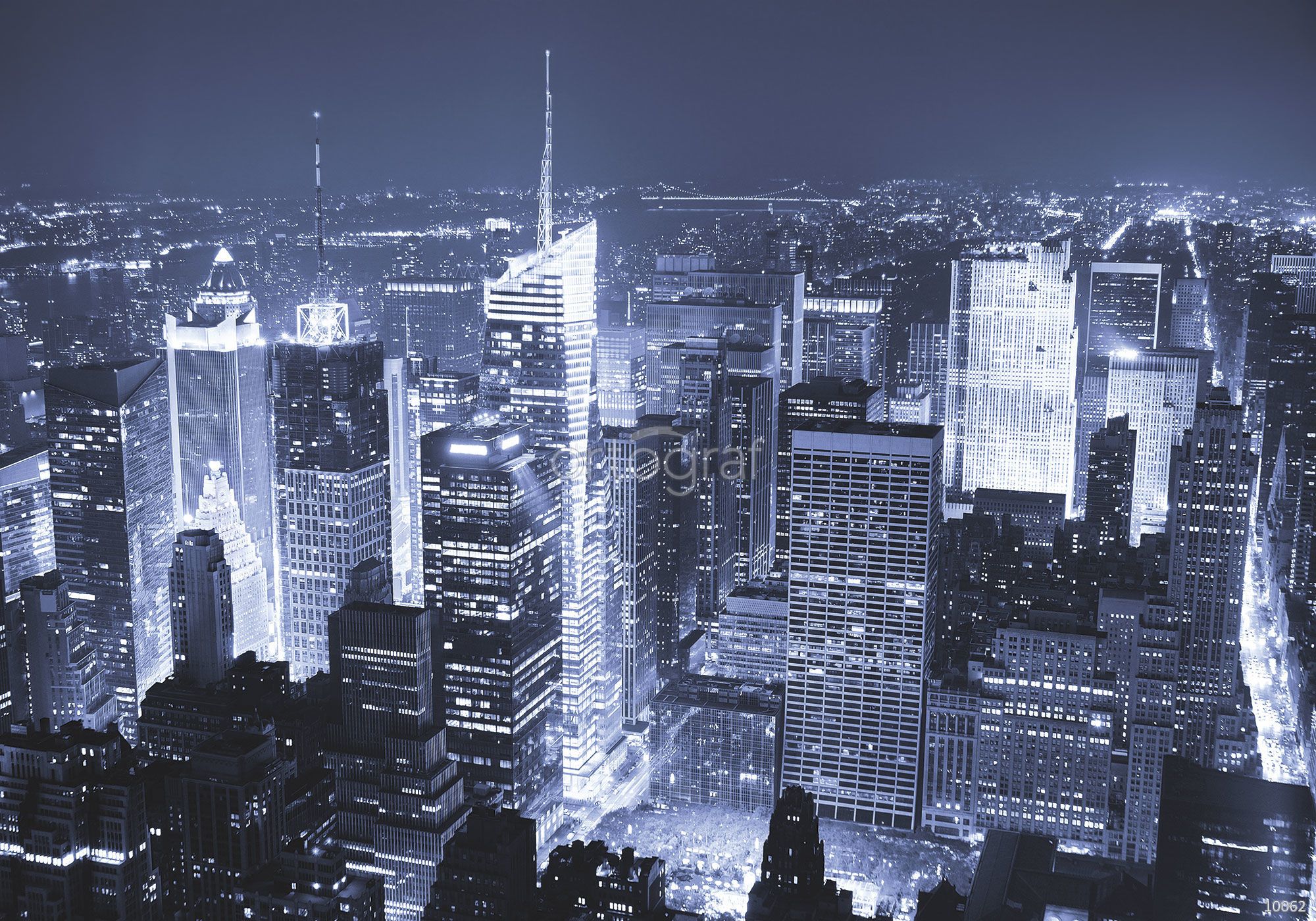 Панорамный вид на мегаполис с высоты: современные небоскрёбы образуют плотную городскую застройку, их фасады сияют яркими огнями и подсветкой. Виден динамичный ночной ритм города, подчёркнутый архитектурой высотных зданий и интенсивной городской атмосферой.