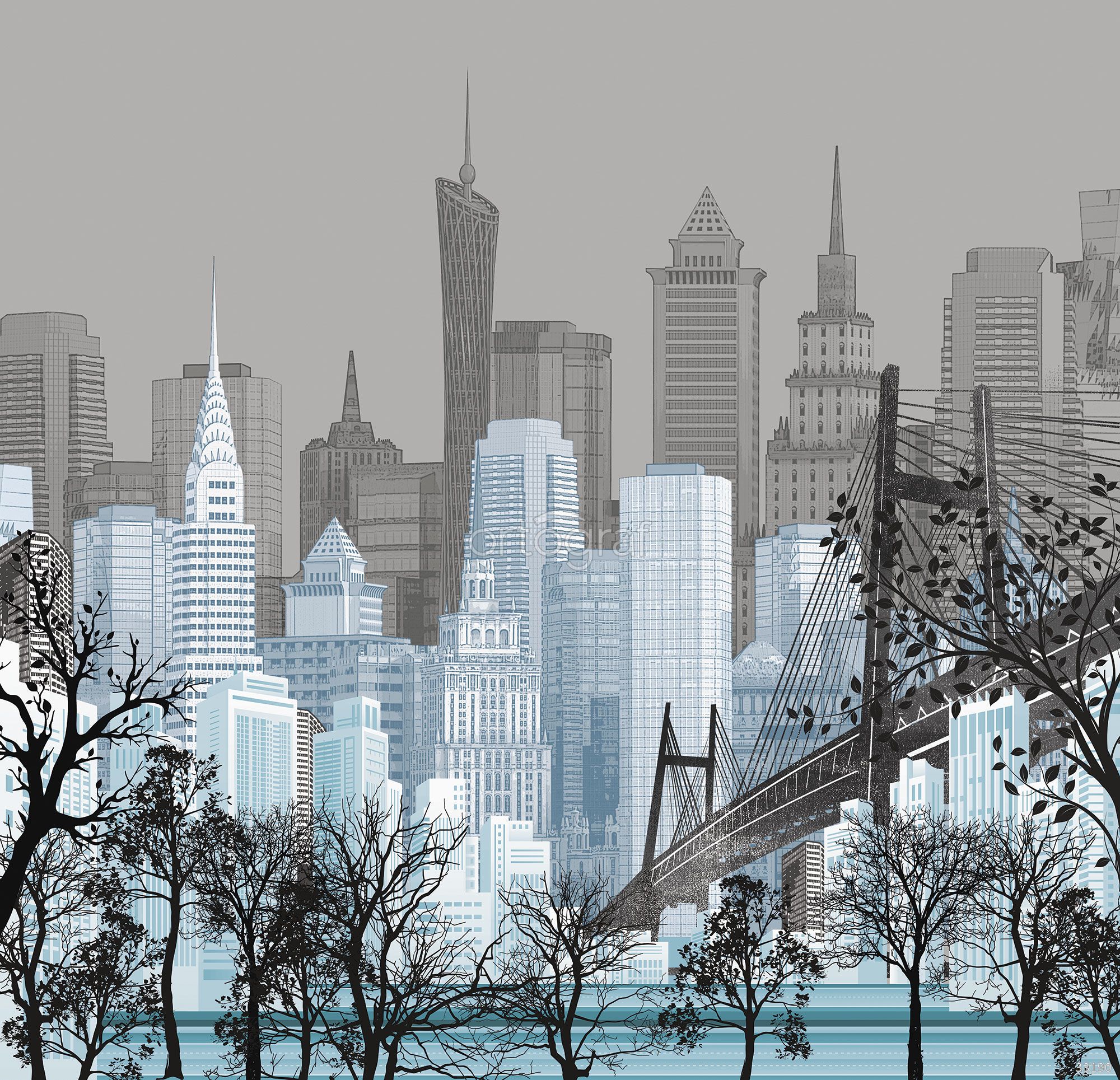 На изображении показан современный городской пейзаж с множеством высотных зданий и массивным мостом на переднем плане, силуэты деревьев подчёркивают динамику сюжета. Графичная композиция создаёт ощущение мегаполиса, энергичности и урбанистического стиля, идеально подходит для современных интерьеров. Такой сюжет добавит пространству ритм большого города и подчеркнёт стиль владельца.